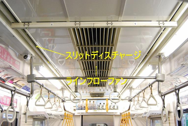 Keywords: 205kei interior no1.JPG ja 205系電車の車内の天井の冷房の吹出し口(スリットディスチャージ)とラインフローファン 投稿 が撮影 toshinori baba 2011-05-30 Cc-zero JNR 205 Saikyō Line