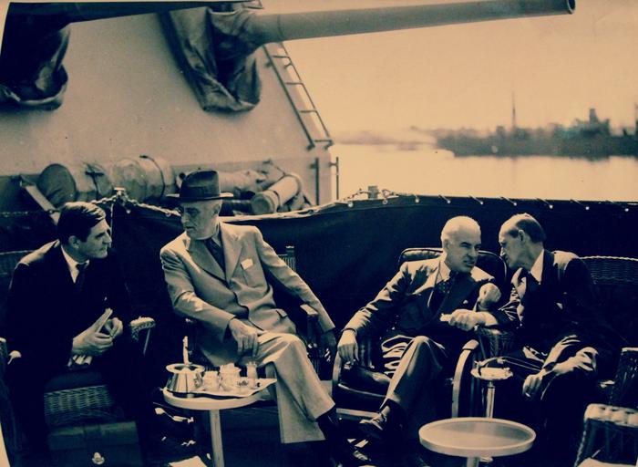 | Keywords: 208-PU-173-F-8: In line with his desire that government heads throughout the world meet frequently to talk as friends and exchange views in order to better understand each other’s problems, President Franklin D. Roosevelt conferred with the three monarchs on his journey from the Big Three conference at Yalta, Crimea. The meetings were on USS Quincey (CA 71) anchored in Great Bitter Lake, near Cairo, through which the Suez Canal passes. Conferring with the President were King Farouk of Egypt; King Ibn Saud of Saudi Arabia, and Haile Selassie, Emperor of Ethiopia. Here, on the deck of Quincy are, left to right: John G. Winant, U.S. Ambassador to Great Britain; President Roosevelt; Secretary of State Edward H. Stettinus, Jr., and Harry Hopkins, February 14, 1945. U.S. Army Signal Corps Photograph. Office of War Information Collection. (2016/08/30). 208-PU-173-F-8: In line with his desire that government heads throughout the world meet frequently to talk as friends and exchange views in order to better understand each other’s problems, President Franklin D. Roosevelt conferred with the three monarchs on his journey from the Big Three conference at Yalta, Crimea. The meetings were on USS Quincey (CA 71) anchored in Great Bitter Lake, near Cairo, through which the Suez Canal passes. Conferring with the President were King Farouk of Egypt; King Ibn Saud of Saudi Arabia, and Haile Selassie, Emperor of Ethiopia. Here, on the deck of Quincy are, left to right: John G. Winant, U.S. Ambassador to Great Britain; President Roosevelt; Secretary of State Edward H. Stettinus, Jr., and Harry Hopkins, February 14, 1945. U.S. Army Signal Corps Photograph. Office of War Information Collection. (2016/08/30). |
