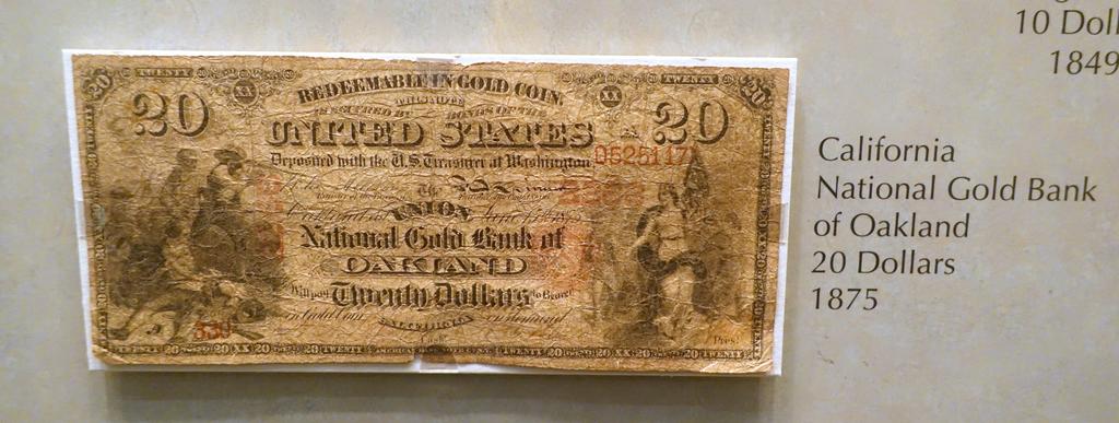 Keywords: 20 Dollars, National Gold Bank of Oakland, California, 1875 - National Museum of American History - DSC00211.jpg en Exhibit in the National Museum of American History Washington DC USA Photography was permitted in the museum without restriction 2015-03-27 11 31 11 own Daderot other versions cc-zero Banknotes in the National Museum of American History Local currencies of the United States