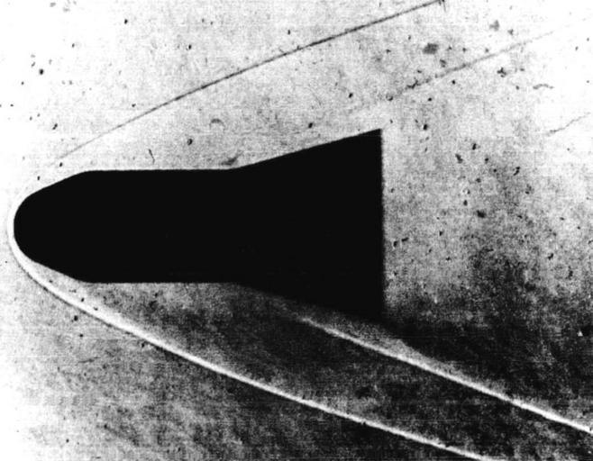 Keywords: blackandwhite monochrome abstract black and white (373-6678): Shadowgraphs such as this one of a blunt cone-flare in free flight at Mach 5 clearly revealed shock waves. The nose shock’s formation some distance ahead of a blunt body greatly reduced the heat transferred to the body at speeds above Mach 5. (373-6678): Shadowgraphs such as this one of a blunt cone-flare in free flight at Mach 5 clearly revealed shock waves. The nose shock’s formation some distance ahead of a blunt body greatly reduced the heat transferred to the body at speeds above Mach 5. |