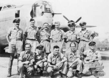 | Keywords: 21 Squadron RAAF Liberator aircrew Fenton NT Mar 1945 AWM NWA0728.jpg AWM caption Australia Northern Territory Fenton Airstrip NT An informal group portrait of the crew of a Consolidated B-24 Liberator bomber aircraft of No 21 Squadron RAAF beside their aircraft <br> Left to right Back row 429329 Warrant Officer WO Clarence James Kelly of Toowong Qld 417376 WO Kenneth George Hiscock of Torrens Park SA 402116 Flight Lieutenant Flt Lt Adam Forsyth Gillespie of Leura NSW 428293 WO later Flying Officer FO Desmond George Brophy of Coburg Vic 410532 WO Clifford George Craven of Nowra NSW 403908 WO Robert Frederick Clemow of Randwick NSW Front Row 25185 Flight Sergeant Flt Sgt later WO Hector George Lutton of Rockhampton Qld 406775 Flt Lt Edward James Daniell of Mt Lawley WA 121390 Sergeant Sgt later Leading Aircraftman LAC Phillip Gregory Hollis of Northcote Victoria 413241 Sgt William Arthur Patterson of Kingsford NSW 433272 FO Warren Lindsay Vaughan of Homebush NSW FO Vaughan was killed in a ground accident on 21 May 1945 while serving with the squadron at Fenton NT He is buried in the Adelaide River War Cemetery NWA0728 1945-03 not stated Copyright expired - public domain PD-AustraliaGov B-24 Liberator aircrew Fenton Airfield Northern Territory No 21 Squadron RAAF World War II forces of Australia in Australia Consolidated Liberator RAAF World War II people of the Royal Australian Air Force ImageNote 1 52 76 34 39 450 324 2 429329 Warrant Officer WO Clarence James Kelly of Toowong Qld ImageNoteEnd 1 ImageNote 2 120 72 28 42 450 324 2 417376 WO Kenneth George Hiscock of Torrens Park SA ImageNoteEnd 2 ImageNote 3 174 90 31 42 450 324 2 402116 Flight Lieutenant Flt Lt Adam Forsyth Gillespie of Leura NSW ImageNoteEnd 3 ImageNote 4 222 86 31 44 450 324 2 428293 WO later Flying Officer FO Desmond George Brophy of Coburg Vic ImageNoteEnd 4 ImageNote 5 274 87 38 49 450 324 2 410532 WO Clifford George Craven of Nowra NSW ImageNoteEnd 5 ImageNote 6 325 90 35 37 450 324 2 403908 WO Robert Frederick Clemow of Randwick NSW ImageNoteEnd 6 ImageNote 7 98 177 32 45 450 324 2 25185 Flight Sergeant Flt Sgt later WO Hector George Lutton of Rockhampton Qld ImageNoteEnd 7 ImageNote 8 149 187 35 45 450 324 2 406775 Flt Lt Edward James Daniell of Mt Lawley WA ImageNoteEnd 8 ImageNote 9 219 185 28 51 450 324 2 121390 Sergeant Sgt later Leading Aircraftman LAC Phillip Gregory Hollis of Northcote Victoria ImageNoteEnd 9 ImageNote 10 285 176 32 48 450 324 2 413241 Sgt William Arthur Patterson of Kingsford NSW ImageNoteEnd 10 ImageNote 11 364 169 35 48 450 324 2 433272 FO Warren Lindsay Vaughan of Homebush NSW ImageNoteEnd 11 |