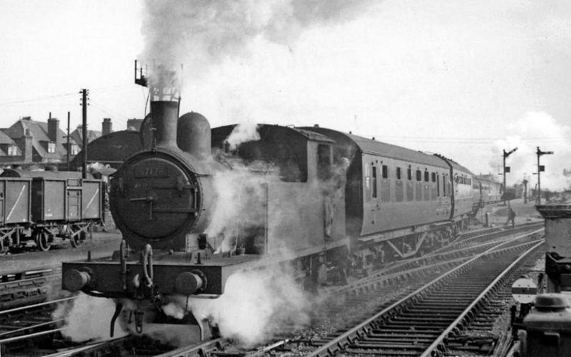 | Keywords: blackandwhite monochrome steam engine locomotive vehicle train steam locomotive outdoor railroad black and white A Holiday express from Derby proceeds from Yarmouth (Beach) station on its last leg to Lowestoft, 1951. An ancient ex-Great Eastern F4 2-4-2T (No. 67176, displaced from its work on London Suburban services) is struggling out with this main-line stock for Lowestoft. Attribution: Ben Brooksbank A Holiday express from Derby proceeds from Yarmouth (Beach) station on its last leg to Lowestoft, 1951. An ancient ex-Great Eastern F4 2-4-2T (No. 67176, displaced from its work on London Suburban services) is struggling out with this main-line stock for Lowestoft. Attribution: Ben Brooksbank |