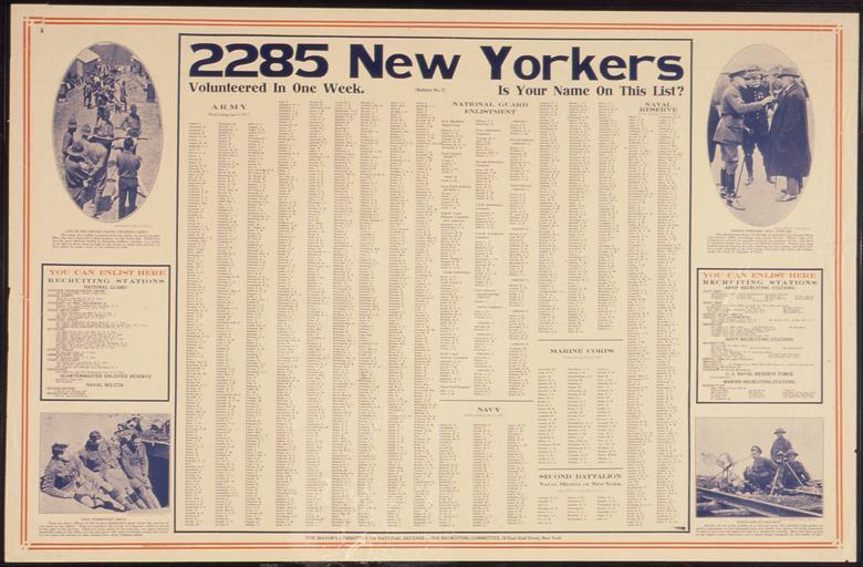 | Keywords: 2285 New Yorkers Volunteered in one week. Is Your Name On This List^, ca. 1917 - ca. 1919 - NARA - 512471.tif Local identifier 4-P-32 U S Food Administration Educational Division Advertising Section 01/15/1918 - 01/1919 Still Picture Records Section Special Media Archives Services Division NWCS-S National Archives at College Park 8601 Adelphi Road College Park MD 20740-6001 other date circa 1917 1919 Record group Record Group 4 Records of the U S Food Administration 1917 - 1920 Record group ARC 333 World War I Posters compiled 1917 - 1919 Series ARC 512439 Variant control numbers NAIL Control Number NWDNS-4-P-32 General notes Scope and content File unit File unit ARC yes <gallery> File 2285_New_Yorkers_Volunteered_in_one_week _Is_Your_Name_On_This_List _ca _1917_-_ca _1919_-_NARA_-_512471 tif tif File 2285_New_Yorkers_Volunteered_in_one_week _Is_Your_Name_On_This_List _ca _1917_-_ca _1919_-_NARA_-_512471 jpg jpg </gallery> NARA-cooperation PD-USGov World War I posters of the United States Propaganda of advertising sections of the United States NARA TIF images with categorized JPGs |