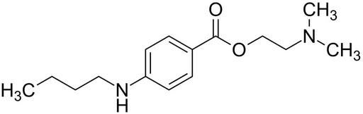 | Keywords: 2-(dimethylamino)ethyl 4-(butylamino)benzoate 200.svg validSVG Structure of 2- dimethylamino ethyl 4- butylamino benzoate Own 2014-05-29 Emeldir <span class signature-talk ></span> Chemical structure verified https //upload wikimedia org/wikipedia/commons/d/d9/2- 28dimethylamino 29ethyl_4- 28butylamino 29benzoate_200 svg 1S/C15H24N2O2/c1-4-5-10-16-14-8-6-13 7-9-14 15 18 19-12-11-17 2 3/h6-9 16H 4-5 10-12H2 1-3H3 GKCBAIGFKIBETG-UHFFFAOYSA-N 94-24-6 Synonyms <small>2- Dimethylamino ethyl 4- butylamino benzoate 2- Dimethylamino ethyl 4- n-butylamino benzoate 2- Dimethylamino ethyl p- butylamino benzoate 2-Dimethylaminoethyl 4-butylaminobenzoate 2-dimethylaminoethyl 4-butylaminobenzoate hydrochloride 4- n-Butylamino benzoic acid 2- dimethylamino ethyl ester 4-14-00-01172 Beilstein Handbook Reference Amethocaine Anetain BRN 2216051 Cetacaine Contralgin Dicain Dikain Fissucain Intercain Laudocaine Medicaine Medihaler-Tetracaine Meethobalm Metraspray Mucaesthin Niphanoid Pontocain Pontocaine Rexocaine Tetracaina Tetracaine Tetracaine Base Tetracaine Base 98 Tetracaine free base Tetracainum TetracaĆna Tetrakaiini Tetrakain Uromucaesthin</small> PD-chem Tetracaine |