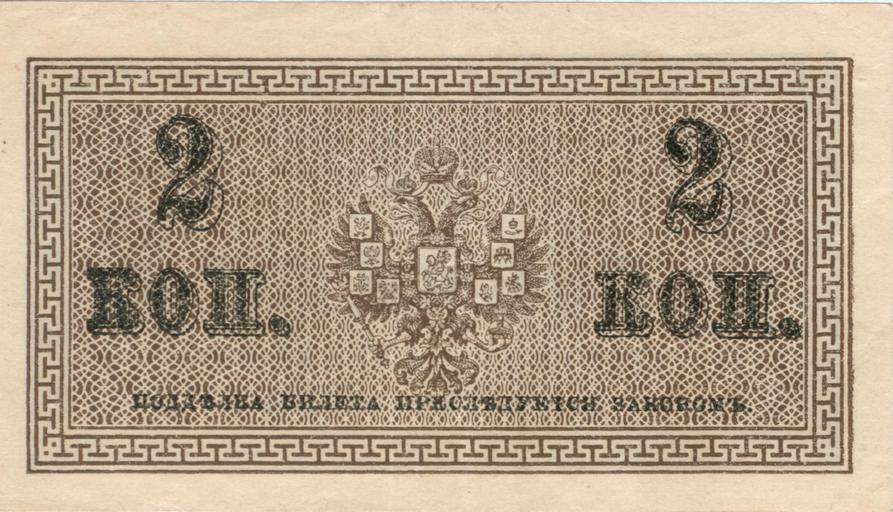 | Keywords: 2 Kopejki back.jpg Разменный знак достоинством 2 копейки об азца 1915 года Российская Импе ия Обо отная сто она Естественные цвета Выпуск Пе вой ми овой войны из-за дефицита монеты когда на од начал п ятать монету се еб яную и медную а азмен на золото был зап ещён с августа 1914 года Russian Empire znak 2 kopejki WWI Version of 1915 year Back Size 45mm x 79 mm scanned note from personal collection 1915 / 2007 original upload date Russian Empire Казначейство / Scanned and processed by NobbiP version 1 and Vizu version 2 PD-RusEmpire PD-old-70 <gallery> image 1 Kopejka front jpg 1 Kopejka Russia front image 1 Kopejka back jpg 1 Kopejka Russia back image 2 Kopejki front jpg 2 Kopejki Russia front </gallery> <references /> Banknotes of the Russian Empire Nicholas II rule Banknotes with a face value of 2 |