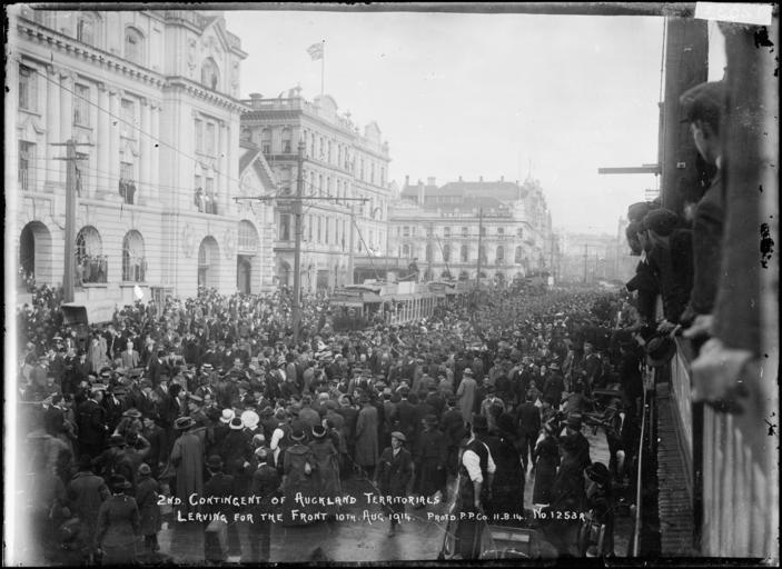 Keywords: blackandwhite monochrome outdoor photo border black and white View of soldiers of the 2nd Contingent, Auckland Territorials marching down Queen Street toward the Queen Street Railway Station on their departure for the Front. Crowds of people have gathered outside the General Post Office to watch. A J J Craig Ltd cart and two tram cars can be seen amongst the crowd. Taken by William A Price on 10 August 1914. Inscriptions: Inscribed - Photographer's title on negative -bottom centre: 2nd. Contingent of Auckland Territorials leaving for the Front. 10th Aug. 1914. Protd. P.P.Co. 11.8.14. No 1253A. Quantity: 1 b&w original negative(s). Physical Description: Dry plate glass negative 4.5 x 6.5 inches 2nd Contingent of Auckland Territorials leaving for the Front. Price, William Archer, 1866-1948 :Collection of post card negatives. Ref: 1/2-000182-G. Alexander Turnbull Library, Wellington, New Zealand. natlib.govt.nz/records/22897993 View of soldiers of the 2nd Contingent, Auckland Territorials marching down Queen Street toward the Queen Street Railway Station on their departure for the Front. Crowds of people have gathered outside the General Post Office to watch. A J J Craig Ltd cart and two tram cars can be seen amongst the crowd. Taken by William A Price on 10 August 1914. Inscriptions: Inscribed - Photographer's title on negative -bottom centre: 2nd. Contingent of Auckland Territorials leaving for the Front. 10th Aug. 1914. Protd. P.P.Co. 11.8.14. No 1253A. Quantity: 1 b&w original negative(s). Physical Description: Dry plate glass negative 4.5 x 6.5 inches 2nd Contingent of Auckland Territorials leaving for the Front. Price, William Archer, 1866-1948 :Collection of post card negatives. Ref: 1/2-000182-G. Alexander Turnbull Library, Wellington, New Zealand. natlib.govt.nz/records/22897993 |