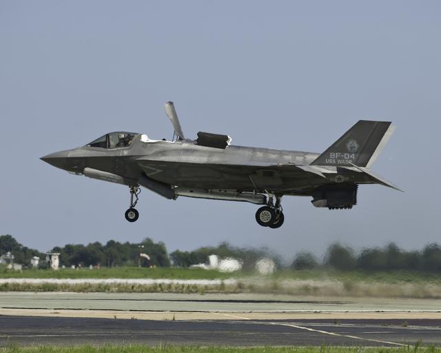 | Keywords: 300th Flight of BF-04, an F-35B Lightning II Short Takeoff and Vertical Landing (STOVL) Aircraft 150710-D-MJ303-354.jpg en During the 300th flight of aircraft BF-04 the F-35B Lightning II Short Takeoff and Vertical Landing variant of the fifth generation stealth fighter performs one of its standard vertical landings aboard NAS Patuxent River on July 10 To date the F-35 program has surpassed 36 000 combined flight hours between F-35 military fleet aircraft and System Development and Demonstration test aircraft The F-35 Operational Fleet features 112 aircraft and the F-35 Test Fleet features 18 aircraft <br>Unit F-35 Lighting II Pax River ITF 2015-07-10 STOVL https //www dvidshub net/image/2077801/300th-flight-bf-04-f-35b-lightning-ii-short-takeoff-and-vertical-landing-stovl-aircraft 150710-D-MJ303-354 2015-07-20 18 51 PATUXENT RIVER MD US PD-USGov F-35B Lightning II in flight Images from DoD uploaded by Fæ |