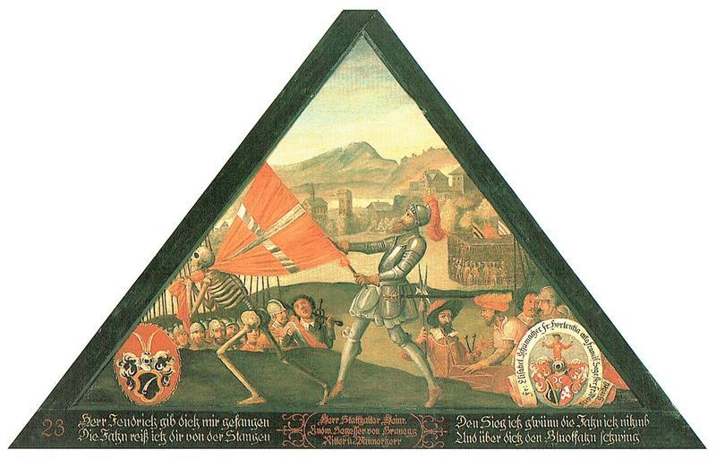 Keywords: 30 Der Faehnrich.jpg de Spreuerbrücke Tafel 30 Der Faehnrich<br /> Herr Fendrich gib dich mir gefangen<br /> die Fahn reiss ich dir von den Stangen<br /> Den Sieg ich g'wünn die Fahn ich nihmb<br /> Und über dich den Bluotfahn schwing 1626 1635 Katalog der Brückenbilder von Heinz Horat Aus dem Buch Die Spreuerbrücke in Luzern Ein barocker Totentanz von europäischer Bedeutung Raeber Verlag Luzern 1996 Kaspar Meglinger 1595-1670 other versions PD-old-100-1923 Paintings of the Spreuerbrucke Lucerne in art Kaspar Meglinger Uploaded with UploadWizard