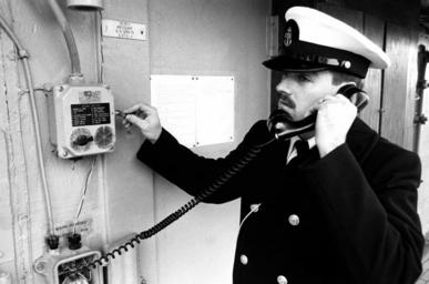 | Keywords: unknown blackandwhite monochrome people indoor black and white 330-CFD-DN-SN-91-04377: A chief petty officer uses a sound-powered phone to communicate with crew members aboard the ocean minesweeper USS Exploit (MSO-440) as the vessel travels to Naval Amphibious Base, Norfolk, Va. While the Exploit remains at the base, its 82 crew members and officers will deploy to the Middle East to replace the crew of the ocean minesweeper USS Adroit (MSO-509). Adroit's current crew has been operating in support of Operation Desert Shield since September, 1/1/1991. Photographed by Ron Fontaine. Official U.S. Navy photograph, now in the collections of the National Archives. (2016/08/29). 330-CFD-DN-SN-91-04377: A chief petty officer uses a sound-powered phone to communicate with crew members aboard the ocean minesweeper USS Exploit (MSO-440) as the vessel travels to Naval Amphibious Base, Norfolk, Va. While the Exploit remains at the base, its 82 crew members and officers will deploy to the Middle East to replace the crew of the ocean minesweeper USS Adroit (MSO-509). Adroit's current crew has been operating in support of Operation Desert Shield since September, 1/1/1991. Photographed by Ron Fontaine. Official U.S. Navy photograph, now in the collections of the National Archives. (2016/08/29). |