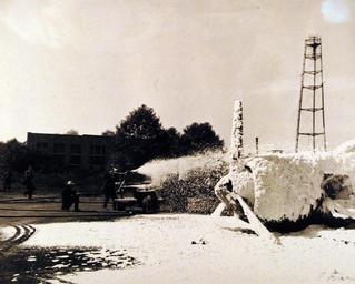 | Keywords: snow outdoor 330-PS-3012 (USN 708723): New Navy Jeep Fire Engine. Featuring a self-contained fire-extinguishing system capable of delivering 1,300 gallons of fire-killing foam per minute for more than two minutes without refilling, the new jeep fire engine was demonstrated at the Naval Research Laboratory. Designed and built by the Laboratory primarily for use in fighting aircraft fires aboard large aircraft carriers, the new equipment required no other power supply than the 60H.P. jeep engine. Capable of spreading a protective cone of foam 30 feet in diameter, it can reach a crashed plane up to 90 feet away. The raw materials for making the foam are carried in small tanks on the jeep. The system can be put in operation simply by opening two valves and speeding up the jeep engine. Requiring only a two-man team, anyone who can drive a jeep and pull a knob can operate it. Designed to supplement the larger-capacity piped foam system aboard aircraft carriers, the jeep fire engine in simulated crash-fire tests, covering 600 square feet and using 150 gallons of gasoline, “rescues” have been made within 24 seconds after it went into action. Photograph released October 7, 1952. (5/12/2015). 330-PS-3012 (USN 708723): New Navy Jeep Fire Engine. Featuring a self-contained fire-extinguishing system capable of delivering 1,300 gallons of fire-killing foam per minute for more than two minutes without refilling, the new jeep fire engine was demonstrated at the Naval Research Laboratory. Designed and built by the Laboratory primarily for use in fighting aircraft fires aboard large aircraft carriers, the new equipment required no other power supply than the 60H.P. jeep engine. Capable of spreading a protective cone of foam 30 feet in diameter, it can reach a crashed plane up to 90 feet away. The raw materials for making the foam are carried in small tanks on the jeep. The system can be put in operation simply by opening two valves and speeding up the jeep engine. Requiring only a two-man team, anyone who can drive a jeep and pull a knob can operate it. Designed to supplement the larger-capacity piped foam system aboard aircraft carriers, the jeep fire engine in simulated crash-fire tests, covering 600 square feet and using 150 gallons of gasoline, “rescues” have been made within 24 seconds after it went into action. Photograph released October 7, 1952. (5/12/2015). |