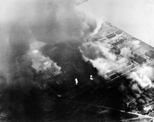 | Keywords: blackandwhite monochrome cloud outdoor black and white 330-PS-484 (USN 707875): Navy Planes Strike Wonsan Oil Refinery. This aerial view shows the damage done to the Wonsan Oil Refinery by planes of the Seventh Fleet on one of the carrier air strikes of July 18, 1950. Black smoke resulting from the damage could be seen sixty miles at sea. (7/17/2015). 330-PS-484 (USN 707875): Navy Planes Strike Wonsan Oil Refinery. This aerial view shows the damage done to the Wonsan Oil Refinery by planes of the Seventh Fleet on one of the carrier air strikes of July 18, 1950. Black smoke resulting from the damage could be seen sixty miles at sea. (7/17/2015). |