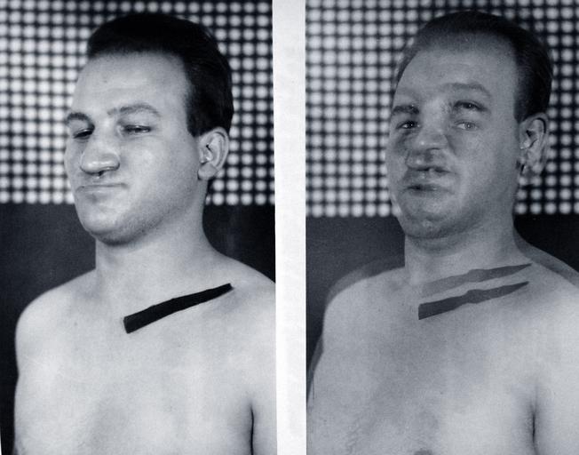 | Keywords: monochrome indoor 330-PS-6457-1: Master Caption: U.S. Navy Studies Effects of Vibrations On Man. To study the effects of mechanical vibrations on man, the U.S. Navy has designed and constructed a research instrument termed a large displacement amplitude vibration machine. The Naval Research Laboratory, cooperating with the Naval Medical Research Institute, Bethesda, Maryland, has completed the first phase of the project by the construction, calibration, and testing of the instrument. Over five years in the building, the instrument has now been assembled and installed at the Naval Medical Research Institute where research studies are being undertaken by Lieutenant Commander David E. Goldman, MC, USN, (a Biophysicist). The two-ton instrument was designed to study low frequency vibrations. It is capable of producing smooth vibrations from two to 50 cycles per second. Constructed to handle loads of up to 200 pounds, the table-top vibrating platform moves vertically through a maximum of four inches at accelerations up to 15 units of gravity. Also, special built-in features allow the investigators to vary the cycles per second and the amplitude while the instrument is in operation, or to hold one and vary the other. As machinery with greater power concentrations is developed, the effects of vibration on operators and maintenance crews become more important. Aviators, operators of heavy construction equipment, operators of pneumatic tools, and of small-hand operated rills, buffing tools, etc., often complain of fatigue and discomfort. Occasionally, there is interference with vision and the ability to perform fine handwork. Little is known at this time as to just what effects vibration has on body tissue. Since the body is very complicated mechanical system, the problem is extremely difficult. The investigators in their studies up to this time have found that different parts of the body respond maximally at different speeds. Studies are now underway to map the mechanical structure of the body and its vibratory motion at various settings of the vibration machine. Studies will then be made of physiological and psychological responses. With this information, it will be possible to establish safety and tolerance limits as well as to devise protective measures when indicated. Subject is shown before vibration; then during vibration. Photograph released January 19, 1954. (4/14/2015). 330-PS-6457-1: Master Caption: U.S. Navy Studies Effects of Vibrations On Man. To study the effects of mechanical vibrations on man, the U.S. Navy has designed and constructed a research instrument termed a large displacement amplitude vibration machine. The Naval Research Laboratory, cooperating with the Naval Medical Research Institute, Bethesda, Maryland, has completed the first phase of the project by the construction, calibration, and testing of the instrument. Over five years in the building, the instrument has now been assembled and installed at the Naval Medical Research Institute where research studies are being undertaken by Lieutenant Commander David E. Goldman, MC, USN, (a Biophysicist). The two-ton instrument was designed to study low frequency vibrations. It is capable of producing smooth vibrations from two to 50 cycles per second. Constructed to handle loads of up to 200 pounds, the table-top vibrating platform moves vertically through a maximum of four inches at accelerations up to 15 units of gravity. Also, special built-in features allow the investigators to vary the cycles per second and the amplitude while the instrument is in operation, or to hold one and vary the other. As machinery with greater power concentrations is developed, the effects of vibration on operators and maintenance crews become more important. Aviators, operators of heavy construction equipment, operators of pneumatic tools, and of small-hand operated rills, buffing tools, etc., often complain of fatigue and discomfort. Occasionally, there is interference with vision and the ability to perform fine handwork. Little is known at this time as to just what effects vibration has on body tissue. Since the body is very complicated mechanical system, the problem is extremely difficult. The investigators in their studies up to this time have found that different parts of the body respond maximally at different speeds. Studies are now underway to map the mechanical structure of the body and its vibratory motion at various settings of the vibration machine. Studies will then be made of physiological and psychological responses. With this information, it will be possible to establish safety and tolerance limits as well as to devise protective measures when indicated. Subject is shown before vibration; then during vibration. Photograph released January 19, 1954. (4/14/2015). |