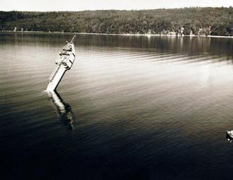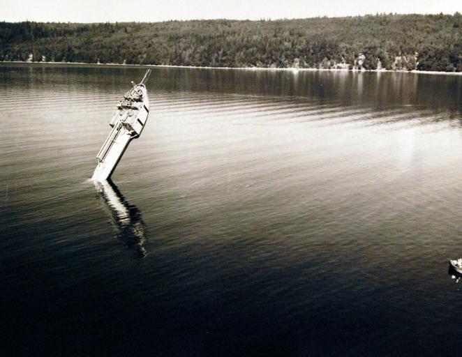 | Keywords: outdoor 330-PSA-207-62 (USN 1061430): Floating Instrument Platform (FLIP). FLIP in a stage of flipping. Photograph released August 7, 1962. Master caption: A new type of oceanographic research vessel – Floating Instrument Platform (FLIP) – is undergoing operational tests by the U.S. Navy in Dabob Bay, near Seattle, Washington. FLIP has been constructed for the Marine Physical Laboratory of Scrupps Institution of Oceanography under contract to the Office of Naval Research. The craft can literally flip from a horizontal to a vertical position while at sea. FLIP is flipped into the vertical position by flooding its long aft section with sea water. Only its “four story” bow section remains above the water. To return the vessel to a horizontal position, high pressure air blows the water out of the submerged section. FLIP will be used for studies of wave motion, marine biology, internal waves, sound waves, and other phenomena. The vessel has accommodation for four people and can carry enough supplies to last for about two weeks. In the vertical position, the research laboratories, living quarters, and engine room are above the water. Two diesel engines supply electrical power for air conditioning and other miscellaneous electrical equipment. Two waterfront tubes permit the crew to descent to 150 feet below the water. Upon completion of the tests in Dabob Bay, FLIP will be towed to San Diego, California, to begin its sea voyages. (10/6/2015). 330-PSA-207-62 (USN 1061430): Floating Instrument Platform (FLIP). FLIP in a stage of flipping. Photograph released August 7, 1962. Master caption: A new type of oceanographic research vessel – Floating Instrument Platform (FLIP) – is undergoing operational tests by the U.S. Navy in Dabob Bay, near Seattle, Washington. FLIP has been constructed for the Marine Physical Laboratory of Scrupps Institution of Oceanography under contract to the Office of Naval Research. The craft can literally flip from a horizontal to a vertical position while at sea. FLIP is flipped into the vertical position by flooding its long aft section with sea water. Only its “four story” bow section remains above the water. To return the vessel to a horizontal position, high pressure air blows the water out of the submerged section. FLIP will be used for studies of wave motion, marine biology, internal waves, sound waves, and other phenomena. The vessel has accommodation for four people and can carry enough supplies to last for about two weeks. In the vertical position, the research laboratories, living quarters, and engine room are above the water. Two diesel engines supply electrical power for air conditioning and other miscellaneous electrical equipment. Two waterfront tubes permit the crew to descent to 150 feet below the water. Upon completion of the tests in Dabob Bay, FLIP will be towed to San Diego, California, to begin its sea voyages. (10/6/2015). |