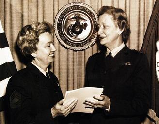 | Keywords: groupshot people indoor 330-PSA-372-62 (USMC A-410756):  First enlisted woman Marine retires – Master Sergeant Catherine G. Murray discusses her retirement plans with Colonel Margaret Henderson, Director of Women Marines.  Master Sergeant Murray will become the first enlisted woman Marine to retire from active duty after completing nearly 20 years of service on November 30.   Photograph released November 29, 1962.  (2015/10/13). 330-PSA-372-62 (USMC A-410756):  First enlisted woman Marine retires – Master Sergeant Catherine G. Murray discusses her retirement plans with Colonel Margaret Henderson, Director of Women Marines.  Master Sergeant Murray will become the first enlisted woman Marine to retire from active duty after completing nearly 20 years of service on November 30.   Photograph released November 29, 1962.  (2015/10/13). |