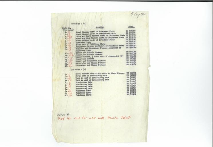 | Keywords: 36093 Photo Guide 2 - NARA - 6003839.jpg Scope and content General notes 6003839 Local identifier Inclosure 2 Photo Guide 2 / MLR Number A-1 3006 Department of Defense Department of the Army U S Army Europe U S Army Berlin Berlin Brigade 12/01/1961 - ca 1992 Most Recent <br/> <br/> Department of Defense Department of the Army U S Army Europe Berlin Command 05/01/1948 - 12/01/1961 Predecessor Archives II Reference Section Military Textual Archives Services Division NWCT2RM National Archives at College Park 8601 Adelphi Road College Park MD 20740-6001 PHONE 301-837-3510; FAX 301-837-1752; EMAIL Archives2reference nara gov NARA-Date 11 22 1961 Record group Record Group 549 Records of United States Army Europe 1942 - 1991 Record group ARC 560363 Intelligence Reports compiled 1954 - 1962 Series ARC 563613 File unit Inclosure 2 U 11/1961 - 11/1961 File unit ARC 6003838 Variant control numbers Declassification Project Number NND 36093HMS/MLR Entry Number A1 3006Search Identifier A City Torn Apart Building of the Berlin WallSearch Identifier siBerlin61Search Identifier The Berlin Crisis of 1961 Building the Wall From Vienna to Checkpoint Charlie Other versions NARA-cooperation PD-USGov United States |