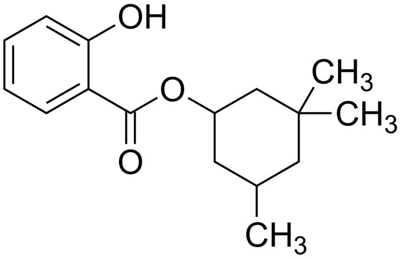 | Keywords: 3,3,5-trimethylcyclohexyl 2-hydroxybenzoate 200.svg validSVG Structure of 3 3 5-trimethylcyclohexyl 2-hydroxybenzoate Own 2014-03-29 Emeldir <span class signature-talk >talk</span> Chemical structure verified https //upload wikimedia org/wikipedia/commons/4/46/3 2C3 2C5-trimethylcyclohexyl_2-hydroxybenzoate_200 svg 1S/C16H22O3/c1-11-8-12 10-16 2 3 9-11 19-15 18 13-6-4-5-7-14 13 17/h4-7 11-12 17H 8-10H2 1-3H3 WSSJONWNBBTCMG-UHFFFAOYSA-N 118-56-9 204-260-8 Synonyms <small>2-Hydroxybenzoic acid 3 3 5-trimethylcyclohexyl ester 3 3 5-Trimethylcyclohexyl salicylate Cyclohexanol 3 3 5-trimethyl- salicylate Heliophan Homomenthyl salicylate Homosalate Salicylic acid 3 3 5-trimethylcyclohexyl ester Trimethylcyclohenyl salicylate</small> PD-chem Sunscreening agents Salicylate esters Cyclohexane derivatives |