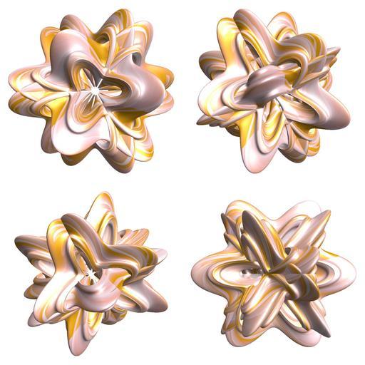 Keywords: mathematica 3d cg parametricplot3d texture torus 輪環 りんかん ドーナツ どーなつ 六芒星 ろくぼうせい 六光星 ろくこうせい 六稜星 ろくりょうせい program プログラム code コード algorithm コード アルゴリズム hexagram geometric sculpture geometricsculpture shape geometry sculpture mapping テクスチャ マッピング 模様 もよう design pattern デザイン パターン graphic グラフィック グラフィクス structure 意匠 構造 symmetry 対称性 たいしょうせい シンメトリー 対称 たいしょう algorithm white background indoor SetOptions[ParametricPlot3D, PlotRange -> Full, Mesh -> None, Boxed -> False, Axes -> None, PlotPoints -> 400, ImageSize -> 1000, PlotStyle -> Directive[Specularity[White, 30], Texture[Import["D:/tmp/861.jpg"]]], TextureCoordinateFunction -> ({#4 + #5, #5/Pi} &), Lighting -> "Neutral"]; a = 3;(* center hole size of a torus *) b = 6;(* hexa-torus *) d = 3;(* number of torus *) g[v_] := Sum[Cos[(2 k - 1) v]/(2 k - 1), {k, 4}]; x = (a - g[t] - Sin[b s]) Cos[s + Pi/(2 b)]; y = Sin[t]; z = (a - g[t] - Sin[b s]) Sin[s + Pi/(2 b)]; rot = Table[{x, y, z}.RotationMatrix[2 i Pi/d, {1, 1, 1}], {i, d}]; ParametricPlot3D[rot, {t, 0, 2 Pi}, {s, 0, 2 Pi}] (*--- The Texture The g[] is a 4-partial sum of the Fourier series for Square wave. g[]は矩形波のフーリエ展開の最初の4項 *) SetOptions[ParametricPlot3D, PlotRange -> Full, Mesh -> None, Boxed -> False, Axes -> None, PlotPoints -> 400, ImageSize -> 1000, PlotStyle -> Directive[Specularity[White, 30], Texture[Import["D:/tmp/861.jpg"]]], TextureCoordinateFunction -> ({#4 + #5, #5/Pi} &), Lighting -> "Neutral"]; a = 3;(* center hole size of a torus *) b = 6;(* hexa-torus *) d = 3;(* number of torus *) g[v_] := Sum[Cos[(2 k - 1) v]/(2 k - 1), {k, 4}]; x = (a - g[t] - Sin[b s]) Cos[s + Pi/(2 b)]; y = Sin[t]; z = (a - g[t] - Sin[b s]) Sin[s + Pi/(2 b)]; rot = Table[{x, y, z}.RotationMatrix[2 i Pi/d, {1, 1, 1}], {i, d}]; ParametricPlot3D[rot, {t, 0, 2 Pi}, {s, 0, 2 Pi}] (*--- The Texture The g[] is a 4-partial sum of the Fourier series for Square wave. g[]は矩形波のフーリエ展開の最初の4項 *) |