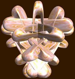Keywords: mathematica 3d cg parametricplot3d texture torus 輪環 りんかん ドーナツ どーなつ 八芒星 はちぼうせい 八光星 はちこうせい 八稜星 はちりょうせい code program algorithm コード プログラム アルゴリズム geometric sculpture geometricsculpture shape geometry sculpture mapping テクスチャ マッピング 模様 もよう abstract 抽象 ちゅうしょう アブストラクト design pattern デザイン パターン graphic グラフィック グラフィクス structure 意匠 構造 symmetry 対称性 たいしょうせい シンメトリー 対称 たいしょう algorithm コード black background indoor a = 3; (* center hole size of a torus *) b = 8; (* octa-torus *) c = -2; (* distance from the center of rotation *) d = 3; (* number of torus *) h = 2; (* height of a torus *) SetOptions[ParametricPlot3D, PlotRange -> Full, Mesh -> None, Boxed -> False, Axes -> False, PlotPoints -> 400, ImageSize -> 3000, Background -> Darker[Orange, 0.8], PlotStyle -> Directive[Specularity[White, 30], Texture[Import["D:/tmp/861.jpg"]]], TextureCoordinateFunction -> ({#4, #5 2 Pi} &), Lighting -> "Neutral"]; f[v_] := Sin[2 Sin[Sin[Sin[v]]]]; x = (a - Cos[t] - f[b s]) Cos[s + Pi/(2 b)]; y = (a - Cos[t] - f[b s]) Sin[s + Pi/(2 b)]; z = (a - Sin[t] - h f[b s]) + c; rm = Table[{x, y, z}.RotationMatrix[2 i Pi/d, {1, 0, 0}], {i, d}]; ParametricPlot3D[rm, {t, 0, 2 Pi}, {s, 0, 2 Pi}] (*--- The Texture *) a = 3; (* center hole size of a torus *) b = 8; (* octa-torus *) c = -2; (* distance from the center of rotation *) d = 3; (* number of torus *) h = 2; (* height of a torus *) SetOptions[ParametricPlot3D, PlotRange -> Full, Mesh -> None, Boxed -> False, Axes -> False, PlotPoints -> 400, ImageSize -> 3000, Background -> Darker[Orange, 0.8], PlotStyle -> Directive[Specularity[White, 30], Texture[Import["D:/tmp/861.jpg"]]], TextureCoordinateFunction -> ({#4, #5 2 Pi} &), Lighting -> "Neutral"]; f[v_] := Sin[2 Sin[Sin[Sin[v]]]]; x = (a - Cos[t] - f[b s]) Cos[s + Pi/(2 b)]; y = (a - Cos[t] - f[b s]) Sin[s + Pi/(2 b)]; z = (a - Sin[t] - h f[b s]) + c; rm = Table[{x, y, z}.RotationMatrix[2 i Pi/d, {1, 0, 0}], {i, d}]; ParametricPlot3D[rm, {t, 0, 2 Pi}, {s, 0, 2 Pi}] (*--- The Texture *) |