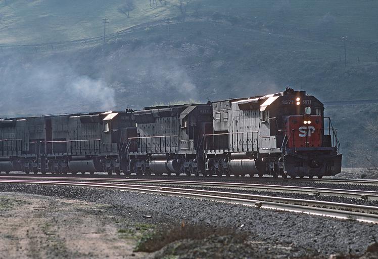 | Keywords: southern pacific southernpacific vehicle railroad locomotive outdoor train He took these in March 1985. The trains were headed geographically west. The tracks make a U-turn at Caliente and just at the right edge of the photos (at cab level) you can see the track at the beginning the climb up the Tehachapi Mountains. The lead AT&SF diesel was 2773 and the SP was 8571. You gotta love the lighting. He took these in March 1985. The trains were headed geographically west. The tracks make a U-turn at Caliente and just at the right edge of the photos (at cab level) you can see the track at the beginning the climb up the Tehachapi Mountains. The lead AT&SF diesel was 2773 and the SP was 8571. You gotta love the lighting. |
