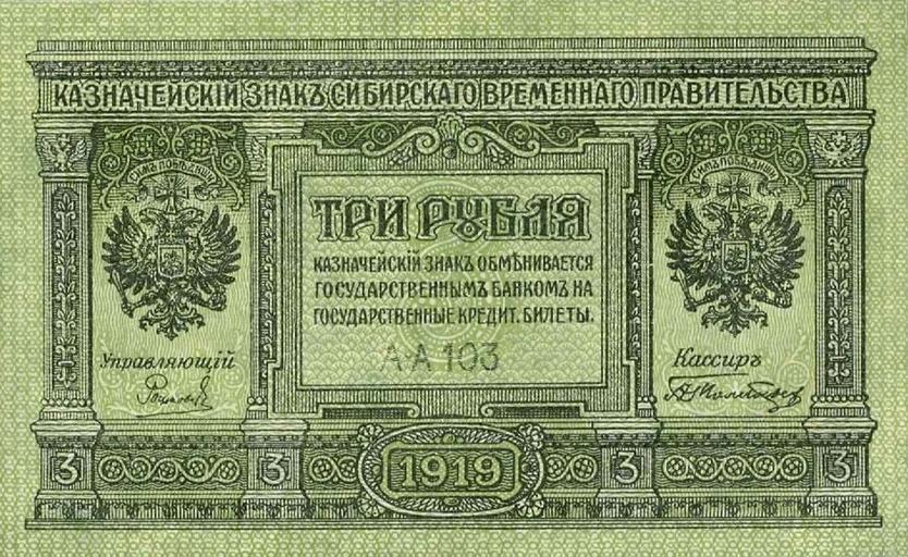 | Keywords: 3 rub Kolchak.jpg п авительством Колчака аве с И кутский областной к аеведческий музей Российское п авительство 1919 PD-Old-70 currency Banknotes of Siberian Provisional Government Green banknotes Banknotes with a face value of 3 Banknotes of Russia 1919 |