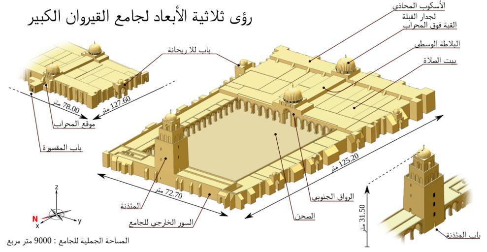 | Keywords: 3D computer modeling of the Great mosquee of Kairouan-ar.svg Great Mosque of Kairouan Tunisia From left to right zoom on the south wall seen from the outside global view of the mosque zoom on the minaret seen from the court Grande Mosquée de Kairouan en Tunisie De gauche à droite zoom sur la façade sud vue de l'extérieur vue d'ensemble de l'édifice zoom sur le minaret vu de la cour Own en Modeled in 6 days using SolidWorks 2001 Post-production in Photoshop and Inkscape Based on architectural plans and fifty photos of the building Tachymètre <span class signature-talk >talk</span> 2010-01-06 English version French version blank version en N B The raster graphic currently incorporated in the SVG has been scaled down to 40 of its original size from 2750 1350 px to 1100 540 px Consequently the SVG file may be scaled up 2 5 times for rendering in an article Architectural 3D drawings Great Mosque of Kairouan |