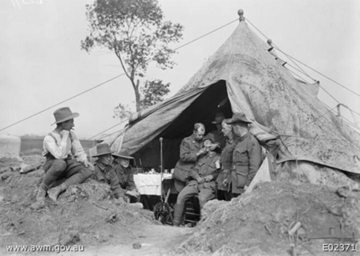 | Keywords: 3rd Dental Unit (AWM E02371).jpg AWM Caption France Picardie Somme Bussy A dental officer of the 34th Australian Dental Unit working at an advanced post at NC 4 9 2 Sheet 62D The sides of the tent was revetted as the staff sleep within and the Germans dropped three bombs within 100 yards of this place one evening This was the most advanced unit working in the Corbie Sector during June and July It gave attention to men requiring immediate relief from the front line and support line The unit worked here for about seven weeks Left to right Driver A E Reid 27th Army Service Corps Private Pte J McTeay 13th Field Ambulance Buglar Gordon http //deepthought hass adfa edu au 8080/showPerson pid 101619 Captain F R Forster Officer Commanding 34th Dental Unit Pte R Turpin patient http //deepthought hass adfa edu au 8080/showPerson pid 254960 10664 Staff Sergeant SSgt William Thomas Rickey 34th Dental Unit behind http //deepthought hass adfa edu au 8080/showPerson pid 207740 13323 Pte Ernest Edward Mildern Orderly 34th Dental Unit http //deepthought hass adfa edu au 8080/showPerson pid 3356 8866 SSgt L H Allen 34th Dental Unit E02371 Originally uploaded in May 2007 to en Wikipedia http //en wikipedia org/w/index php title Special Log page File 3rd_Dental_Unit_ AWM_E02371 jpg log by Nick-D talk 1918-06-03 photographer not identified Copyright expired - public domain PD-AustraliaGov World War I forces of Australia in France Military medical services in World War I Dentists at work Black and white photographs of war Bussy-lès-Daours |