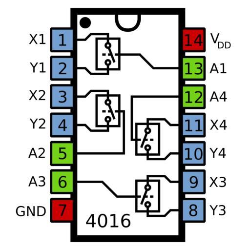 Keywords: 4016 Pinout.svg en Pinout diagram of the 4016 quad bilateral switch IC own Inductiveload 2009-09-16 IC pinout diagrams