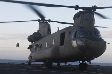 | Keywords: 40th cab 40thcab 40th combat aviation brigade 40thcombataviationbrigade ch-47 chinook ch47chinook chinook helicopter deck landing qualification decklandingqualification dlq deck landing decklanding uss ponce ussponce afsb afloat forward staging base afloatforwardstagingbase aviation pilot army soldier california army national guard californiaarmynationalguard 1-168 avn 1168avn washington national guard washingtonnationalguard oregon national guard oregonnationalguard persian gulf persiangulf vehicle aircraft rotor blade outdoor Two Army National Guard Ch-47 Chinook helicopters from Company B, 1st Battalion, 168th Aviation Regiment, 40th Combat Aviation Brigade, touch down aboard the USS Ponce, an Afloat Forward Staging Base, in the Persian Gulf March 14. The 40th CAB practices landings aboard Naval vessels every month. (U.S. Army photo by Staff Sgt. Ian M. Kummer) Two Army National Guard Ch-47 Chinook helicopters from Company B, 1st Battalion, 168th Aviation Regiment, 40th Combat Aviation Brigade, touch down aboard the USS Ponce, an Afloat Forward Staging Base, in the Persian Gulf March 14. The 40th CAB practices landings aboard Naval vessels every month. (U.S. Army photo by Staff Sgt. Ian M. Kummer) |