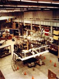 | Keywords: 428-GX-K-122009: Washington Navy Yard, Washington, D.C. Naval Shipyard men from Boston Naval Shipyard and Navy Memorial Museum employees prepare the standard rigging and fixtures on the fighting top of the frigate USS Constitution which is being placed on exhibit in the museum. Photographed by PH1 Terry Mitchell, April 1978. U.S. Navy Photograph, now in the collections of the National Archives. (2016/02/02). Note, photographed from reference card 428-GX-K-122009: Washington Navy Yard, Washington, D.C. Naval Shipyard men from Boston Naval Shipyard and Navy Memorial Museum employees prepare the standard rigging and fixtures on the fighting top of the frigate USS Constitution which is being placed on exhibit in the museum. Photographed by PH1 Terry Mitchell, April 1978. U.S. Navy Photograph, now in the collections of the National Archives. (2016/02/02). Note, photographed from reference card |