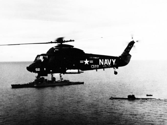 Keywords: blackandwhite monochrome outdoor black and white 428-GX-USN-1154393: Cold War, Soviet Ships. Mediterranean Sea. A light helicopter antisubmarine squadron 30 (HSL-30) SH-2D “Seasprite” Helicopter tracks a Soviet “Sverdlov” class cruiser and a Soviet submarine about sixty miles east of Gibraltar. The Seasprite is equipped with the Light Airborne Multipurpose System (LAMPS) and is assigned aboard USS William L. Standley (DLG-32). Photographed November 1972. U.S. Navy Photograph, now in the collections of the National Archives. (2016/05/03). 428-GX-USN-1154393: Cold War, Soviet Ships. Mediterranean Sea. A light helicopter antisubmarine squadron 30 (HSL-30) SH-2D “Seasprite” Helicopter tracks a Soviet “Sverdlov” class cruiser and a Soviet submarine about sixty miles east of Gibraltar. The Seasprite is equipped with the Light Airborne Multipurpose System (LAMPS) and is assigned aboard USS William L. Standley (DLG-32). Photographed November 1972. U.S. Navy Photograph, now in the collections of the National Archives. (2016/05/03).