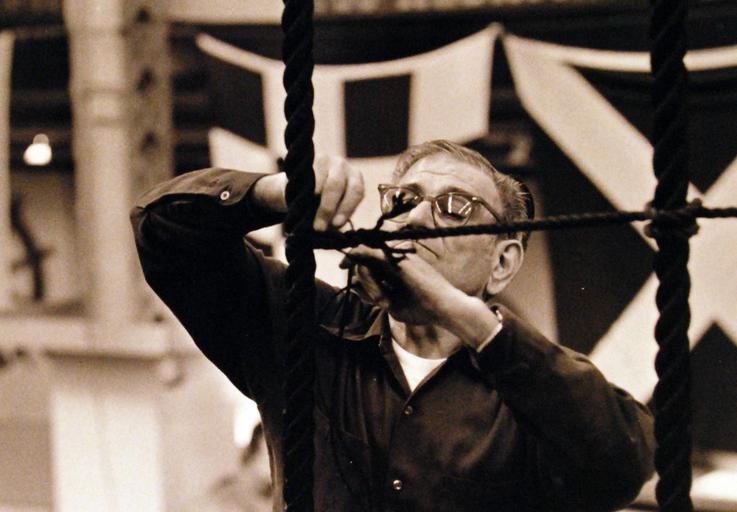 | Keywords: 428-GX-USN 1173528: Navy Memorial Museum at the Washington Navy Yard, Washington, D.C. Navy Shipyard Rigger Ralph Yarn from Boston Naval Shipyard splices a line on the standard rigging for the fighting top of USS Constitution which is being placed on exhibit in the museum. Photographed by PH1 Terry Mitchell, April 14, 1978. U.S. Navy Photograph, now in the collections of the National Archives. (2016/02/02). Note, photographed from reference card 428-GX-USN 1173528: Navy Memorial Museum at the Washington Navy Yard, Washington, D.C. Navy Shipyard Rigger Ralph Yarn from Boston Naval Shipyard splices a line on the standard rigging for the fighting top of USS Constitution which is being placed on exhibit in the museum. Photographed by PH1 Terry Mitchell, April 14, 1978. U.S. Navy Photograph, now in the collections of the National Archives. (2016/02/02). Note, photographed from reference card |