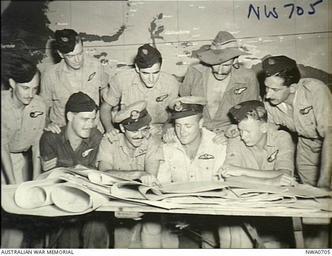 Keywords: 43 Squadron RAAF Catalina aircrew Darwin Oct 1944 AWM NWA0705.jpg AWM caption Australia Northern Territory Darwin Informal group portrait of the crew of a RAAF Catalina of 43 Squadron RAAF captained by Flying Officer FO Armand Andre Etienne of West Perth WA discussing a rescue they carried out on a sister Catalina aircraft serial number A24-100 code number RK-L of 42 Squadron RAAF which had force landed in the open sea south of the South Western Celebes Peninsula after being damaged by anti-aircraft fire on a mine laying operation in Macassar Celebes Harbour The rescue operation entailed a round trip of 1800 miles mainly through enemy held territory <br> Identified but most positions unknown 415632 FO later Flight Lieutenant Flt Lt DFC Armand Andre Etienne Captain of West Perth WA seated second from left 408409 FO later Flt Lt Ian McCallister Robson of Sandy Bay Tas 428809 Flight Sergeant Flt Sgt later Warrant Officer WO John Joseph Sweeney Navigator of Newcastle NSW seated left wearing dark uniform with sergeant's stripes 428832 Flt Sgt later WO Raymond Victor Tumeth of Haberfield NSW 428360 Flt Sgt later WO Derek Fanshawe Robertson of Camberwell Vic 12912 Sergeant Sgt later PO Robert Richard Tingman of Brighton Vic 12223 Sgt later Flt Sgt Albert Leslie Warton of Sydney NSW A2398 Sgt Thomas Roy Elphick of Bondi NSW 33642 Corporal James Francis Burgess Oliver of Glen Innes of NSW NWA0705 1944-10-25 Department of Air Copyright expired - public domain PD-AustraliaGov PBY Catalina aircrew World War II people of the Royal Australian Air Force World War II forces of Australia in Australia No 43 Squadron RAAF ImageNote 1 213 192 87 103 640 494 2 Armand Andre Etienne Captain of West Perth WA ImageNoteEnd 1 ImageNote 2 116 174 85 114 640 494 2 428809 Flight Sergeant Flt Sgt later Warrant Officer WO John Joseph Sweeney Navigator of Newcastle NSW ImageNoteEnd 2 |