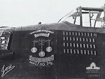 | Keywords: 467 Squadron RAAF Lancaster nose art AWM UK0463.jpg AWM caption England Lincolnshire Waddington The emblem on M Mother a Lancaster aircraft PO-M ED547 belonging to 467 Squadron RAAF of Bomber Command based at RAF Station Waddington This aircraft was originally U Uncle hence the pawnshop or uncles sign Quite appropriate is the note we take anything for the captain 405853 Pilot Officer J H Whiting Adelaide SA is noted for his ability to return to base in spite of damage to aircraft from flak or night fighter combat The forty bombs represent raids over enemy territory and the inverted swastika a night fighter which the crew shot down Under new management describes the change from U to M or from 'U to Me as it is worded UK0463 1943-08-31 not stated PD-Australia Nose art on Avro Lancaster RAF Waddington No 467 Squadron RAAF Avro Lancaster in Australian service |