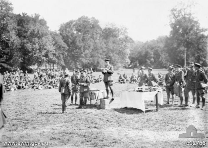 | Keywords: 4 bde (E02758).jpg AWM Caption Lieutenant General Sir John Monash KCB VD presenting decorations to members of the 4th Australian Infantry Brigade after their success in the Battle of Hamel Left to right Unidentified soldier receiving decoration Brigadier General C H Brand CB CMG DSO General Monash http //deepthought hass adfa edu au 8080/showPerson pid 275141 Captain P W Simonson Aide de camp to Corps Commander http //deepthought hass adfa edu au 8080/showPerson pid 168583 Captain Capt R H Lackman Staff Captain 4th Australian Infantry Brigade standing on boxes Lieutenant Colonel H W Murray VC DSO DCM or Lieutenant G F Wilson Aide de camp 14th Battalion http //deepthought hass adfa edu au 8080/showPerson pid 216272 Capt A M Moulden http //deepthought hass adfa edu au 8080/showPerson pid 205155 Lieutenant Colonel P T McSharry DSO MC 15th Battalion Mr C E W Charles Bean Official War Correspondent E02758 Originally uploaded in July 2007 to en Wikipedia http //en wikipedia org/w/index php title Special Log page File 4_bde_ E02758 jpg log by Nick-D talk 1918-07-20 photographer not identified Copyright expired - public domain PD-AustraliaGov World War I forces of Australia in France Battle of Hamel John Monash Black and white photographs of parades Brigadier generals |
