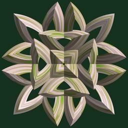 Keywords: mathematica 3d cg parametricplot3d texture torus code program algorithm プログラム コード アルゴリズム 輪環 りんかん ドーナツ どーなつ 六芒星 ろくぼうせい geometric sculpture geometricsculpture shape geometry sculpture mapping テクスチャ マッピング 模様 もよう abstract 抽象 ちゅうしょう アブストラクト design pattern デザイン パターン graphic グラフィック グラフィクス structure 意匠 構造 symmetry 対称性 たいしょうせい シンメトリー 対称 たいしょう organic pattern outdoor black background a = 3; (* center hole size *) b = 6; (* hexa-torus *) c = 2; (* distance from the center of rotation *) d = 4; (* number of torus *) h = 2; (* height of a torus *) SetOptions[ParametricPlot3D, PlotRange -> Full, Mesh -> None, Boxed -> False, Axes -> False, PlotPoints -> 400, ImageSize -> 3000, Background -> RGBColor[{20, 50, 30}/255], PlotStyle -> Directive[Specularity[White, 40], Texture[Import["D:/tmp/862.jpg"]]], TextureCoordinateFunction -> ({#4 + #5, #5 / Pi} &), Lighting -> "Neutral"]; f[v_] := TriangleWave[{-1, 1}, v/(2 Pi)]; g[v_] := TriangleWave[{-1, 1}, v/(2 Pi) + 1/4]; x = (a - g[t] - f[b s]) Cos[s] + c; y = (a - g[t] - f[b s]) Sin[s] + c; z = (a - f[t] - h f[b s]); rm = Table[{x, y, z}.RotationMatrix[2 i Pi/d, {0, 0, 1}], {i, d}]; ParametricPlot3D[rm, {t, 0, 2 Pi}, {s, 0, Pi}] (*--- The Texture *) a = 3; (* center hole size *) b = 6; (* hexa-torus *) c = 2; (* distance from the center of rotation *) d = 4; (* number of torus *) h = 2; (* height of a torus *) SetOptions[ParametricPlot3D, PlotRange -> Full, Mesh -> None, Boxed -> False, Axes -> False, PlotPoints -> 400, ImageSize -> 3000, Background -> RGBColor[{20, 50, 30}/255], PlotStyle -> Directive[Specularity[White, 40], Texture[Import["D:/tmp/862.jpg"]]], TextureCoordinateFunction -> ({#4 + #5, #5 / Pi} &), Lighting -> "Neutral"]; f[v_] := TriangleWave[{-1, 1}, v/(2 Pi)]; g[v_] := TriangleWave[{-1, 1}, v/(2 Pi) + 1/4]; x = (a - g[t] - f[b s]) Cos[s] + c; y = (a - g[t] - f[b s]) Sin[s] + c; z = (a - f[t] - h f[b s]); rm = Table[{x, y, z}.RotationMatrix[2 i Pi/d, {0, 0, 1}], {i, d}]; ParametricPlot3D[rm, {t, 0, 2 Pi}, {s, 0, Pi}] (*--- The Texture *) |