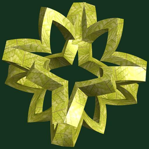 Keywords: mathematica 3d cg parametricplot3d texture torus code program algorithm プログラム コード アルゴリズム 輪環 りんかん ドーナツ どーなつ 六芒星 ろくぼうせい geometric sculpture geometricsculpture shape geometry sculpture mapping テクスチャ マッピング 模様 もよう abstract 抽象 ちゅうしょう アブストラクト design pattern デザイン パターン graphic グラフィック グラフィクス structure 意匠 構造 symmetry 対称性 たいしょうせい シンメトリー 対称 たいしょう foliage leaf plant black background ancient a = 4; (* center hole size *) b = 6; (* hexa-torus *) c = 0; (* distance from the center of rotation *) d = 4; (* number of torus *) h = 1; (* height of a torus *) SetOptions[ParametricPlot3D, PlotRange -> Full, Mesh -> None, Boxed -> False, Axes -> False, PlotPoints -> 400, ImageSize -> 3000, Background -> RGBColor[{20, 50, 30}/255], PlotStyle -> Directive[Specularity[White, 30], Texture[Import["D:/tmp/71.jpg"]]], TextureCoordinateFunction -> ({#4, #5 Pi} &), Lighting -> "Neutral"]; f[v_] := TriangleWave[{-1, 1}, v/(2 Pi)]; g[v_] := TriangleWave[{-1, 1}, v/(2 Pi) + 1/4]; x = (a - g[t] - f[b s]) Cos[s]; y = (a - g[t] - f[b s]) Sin[s]; z = (a - f[t] - h f[b s]) + c; rm = Table[{x, y, z}.RotationMatrix[2 i Pi/d, {1, 1, 0}], {i, d}]; ParametricPlot3D[rm, {t, 0, 2 Pi}, {s, 0, Pi}] (*--- The Texture *) a = 4; (* center hole size *) b = 6; (* hexa-torus *) c = 0; (* distance from the center of rotation *) d = 4; (* number of torus *) h = 1; (* height of a torus *) SetOptions[ParametricPlot3D, PlotRange -> Full, Mesh -> None, Boxed -> False, Axes -> False, PlotPoints -> 400, ImageSize -> 3000, Background -> RGBColor[{20, 50, 30}/255], PlotStyle -> Directive[Specularity[White, 30], Texture[Import["D:/tmp/71.jpg"]]], TextureCoordinateFunction -> ({#4, #5 Pi} &), Lighting -> "Neutral"]; f[v_] := TriangleWave[{-1, 1}, v/(2 Pi)]; g[v_] := TriangleWave[{-1, 1}, v/(2 Pi) + 1/4]; x = (a - g[t] - f[b s]) Cos[s]; y = (a - g[t] - f[b s]) Sin[s]; z = (a - f[t] - h f[b s]) + c; rm = Table[{x, y, z}.RotationMatrix[2 i Pi/d, {1, 1, 0}], {i, d}]; ParametricPlot3D[rm, {t, 0, 2 Pi}, {s, 0, Pi}] (*--- The Texture *) |