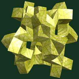 Keywords: mathematica 3d cg parametricplot3d texture torus code program algorithm プログラム コード アルゴリズム 輪環 りんかん ドーナツ どーなつ 六芒星 ろくぼうせい geometric sculpture geometricsculpture shape geometry sculpture mapping テクスチャ マッピング 模様 もよう abstract 抽象 ちゅうしょう アブストラクト design pattern デザイン パターン graphic グラフィック グラフィクス structure 意匠 構造 symmetry 対称性 たいしょうせい シンメトリー 対称 たいしょう foliage leaf plant tree black background organic pattern a = 4; (* center hole size *) b = 6; (* hexa-torus *) c = -4; (* distance from the center of rotation *) d = 4; (* number of torus *) h = 1; (* height of a torus *) SetOptions[ParametricPlot3D, PlotRange -> Full, Mesh -> None, Boxed -> False, Axes -> False, PlotPoints -> 400, ImageSize -> 3000, Background -> RGBColor[{20, 50, 30}/255], PlotStyle -> Directive[Specularity[White, 30], Texture[Import["D:/tmp/71.jpg"]]], TextureCoordinateFunction -> ({#4, #5 Pi} &), Lighting -> "Neutral"]; f[v_] := TriangleWave[{-1, 1}, v/(2 Pi)]; g[v_] := TriangleWave[{-1, 1}, v/(2 Pi) + 1/4]; x = (a - g[t] - f[b s]) Cos[s]; y = (a - g[t] - f[b s]) Sin[s]; z = (a - f[t] - h f[b s]) + c; rm = Table[{x, y, z}.RotationMatrix[2 i Pi/d, {1, 1, 0}], {i, d}]; ParametricPlot3D[rm, {t, 0, 2 Pi}, {s, 0, Pi}] (*--- The Texture *) a = 4; (* center hole size *) b = 6; (* hexa-torus *) c = -4; (* distance from the center of rotation *) d = 4; (* number of torus *) h = 1; (* height of a torus *) SetOptions[ParametricPlot3D, PlotRange -> Full, Mesh -> None, Boxed -> False, Axes -> False, PlotPoints -> 400, ImageSize -> 3000, Background -> RGBColor[{20, 50, 30}/255], PlotStyle -> Directive[Specularity[White, 30], Texture[Import["D:/tmp/71.jpg"]]], TextureCoordinateFunction -> ({#4, #5 Pi} &), Lighting -> "Neutral"]; f[v_] := TriangleWave[{-1, 1}, v/(2 Pi)]; g[v_] := TriangleWave[{-1, 1}, v/(2 Pi) + 1/4]; x = (a - g[t] - f[b s]) Cos[s]; y = (a - g[t] - f[b s]) Sin[s]; z = (a - f[t] - h f[b s]) + c; rm = Table[{x, y, z}.RotationMatrix[2 i Pi/d, {1, 1, 0}], {i, d}]; ParametricPlot3D[rm, {t, 0, 2 Pi}, {s, 0, Pi}] (*--- The Texture *) |