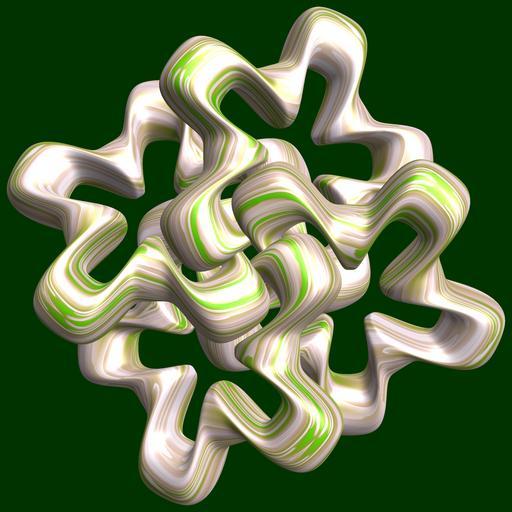 | Keywords: mathematica 3d cg parametricplot3d texture torus 輪環 りんかん ドーナツ どーなつ 五芒星 ごぼうせい 五光星 ごこうせい 五稜星 ごりょうせい プログラム コード code program algorithm コード アルゴリズム pentagram geometric sculpture geometricsculpture shape geometry sculpture mapping テクスチャ マッピング 模様 もよう design pattern デザイン パターン graphic グラフィック グラフィクス structure 意匠 構造 symmetry 対称性 たいしょうせい シンメトリー 対称 たいしょう algorithm indoor SetOptions[ParametricPlot3D, PlotRange -> Full, Mesh -> None, Boxed -> False, Axes -> None, PlotPoints -> 300, ImageSize -> 3000, Background -> Darker[Green, 0.8], PlotStyle -> Directive[Specularity[White, 30], Texture[Import["D:/tmp/862.jpg"]]], TextureCoordinateFunction -> ({#4 + #5, #5/Pi} &), Lighting -> "Neutral"]; a = 3; (* center hole size of a torus *) b = 5; (* penta-torus *) c = 3; (* distance from the center of rotation *) d = 4; (* number of torus *) f[v_] := Sin[2 Sin[Sin[Sin[v]]]]; x = (a - Cos[t] - f[b s]) Cos[s + Pi/(2 b)] + c; y = Sin[t] + c; z = (a - Cos[t] - f[b s]) Sin[s + Pi/(2 b)] + c; rot = Table[{x, y, z}.RotationMatrix[2 i Pi/d, {1, 2, 0}], {i, d}]; ParametricPlot3D[rot, {t, 0, 2 Pi}, {s, 0, 2 Pi}] (* --- The Texture *) SetOptions[ParametricPlot3D, PlotRange -> Full, Mesh -> None, Boxed -> False, Axes -> None, PlotPoints -> 300, ImageSize -> 3000, Background -> Darker[Green, 0.8], PlotStyle -> Directive[Specularity[White, 30], Texture[Import["D:/tmp/862.jpg"]]], TextureCoordinateFunction -> ({#4 + #5, #5/Pi} &), Lighting -> "Neutral"]; a = 3; (* center hole size of a torus *) b = 5; (* penta-torus *) c = 3; (* distance from the center of rotation *) d = 4; (* number of torus *) f[v_] := Sin[2 Sin[Sin[Sin[v]]]]; x = (a - Cos[t] - f[b s]) Cos[s + Pi/(2 b)] + c; y = Sin[t] + c; z = (a - Cos[t] - f[b s]) Sin[s + Pi/(2 b)] + c; rot = Table[{x, y, z}.RotationMatrix[2 i Pi/d, {1, 2, 0}], {i, d}]; ParametricPlot3D[rot, {t, 0, 2 Pi}, {s, 0, 2 Pi}] (* --- The Texture *) |
