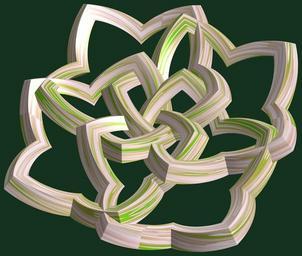 Keywords: mathematica 3d cg parametricplot3d texture torus code program algorithm プログラム コード アルゴリズム 輪環 りんかん ドーナツ どーなつ 五芒星 ごぼうせい geometric sculpture geometricsculpture shape geometry sculpture mapping テクスチャ マッピング 模様 もよう abstract 抽象 ちゅうしょう アブストラクト design pattern デザイン パターン graphic グラフィック グラフィクス structure 意匠 構造 symmetry 対称性 たいしょうせい シンメトリー 対称 たいしょう black background tangle a = 6; (* center hole size *) b = 5; (* penta-torus *) c = 3; (* distance from the center of rotation *) d = 4; (* number of torus *) h = 1; (* height of a torus *) SetOptions[ParametricPlot3D, PlotRange -> Full, Mesh -> None, Boxed -> False, Axes -> False, PlotPoints -> 400, ImageSize -> 3000, Background -> RGBColor[{20, 50, 30}/255], PlotStyle -> Directive[Specularity[White, 70], Texture[Import["D:/tmp/862.jpg"]]], TextureCoordinateFunction -> ({#4 + #5, #5 / Pi} &), Lighting -> "Neutral"]; f[v_] := TriangleWave[{-1, 1}, v/(2 Pi)]; g[v_] := TriangleWave[{-1, 1}, v/(2 Pi) + 1/4]; x = (a - g[t] - f[b s]) Cos[s] + c; y = (a - g[t] - f[b s]) Sin[s] + c; z = (a - f[t] - h f[b s]); rm = Table[{x, y, z}.RotationMatrix[2 i Pi/d, {0, 0, 1}], {i, d}]; ParametricPlot3D[rm, {t, 0, 2 Pi}, {s, 0, Pi}] (*--- The Texture *) a = 6; (* center hole size *) b = 5; (* penta-torus *) c = 3; (* distance from the center of rotation *) d = 4; (* number of torus *) h = 1; (* height of a torus *) SetOptions[ParametricPlot3D, PlotRange -> Full, Mesh -> None, Boxed -> False, Axes -> False, PlotPoints -> 400, ImageSize -> 3000, Background -> RGBColor[{20, 50, 30}/255], PlotStyle -> Directive[Specularity[White, 70], Texture[Import["D:/tmp/862.jpg"]]], TextureCoordinateFunction -> ({#4 + #5, #5 / Pi} &), Lighting -> "Neutral"]; f[v_] := TriangleWave[{-1, 1}, v/(2 Pi)]; g[v_] := TriangleWave[{-1, 1}, v/(2 Pi) + 1/4]; x = (a - g[t] - f[b s]) Cos[s] + c; y = (a - g[t] - f[b s]) Sin[s] + c; z = (a - f[t] - h f[b s]); rm = Table[{x, y, z}.RotationMatrix[2 i Pi/d, {0, 0, 1}], {i, d}]; ParametricPlot3D[rm, {t, 0, 2 Pi}, {s, 0, Pi}] (*--- The Texture *)