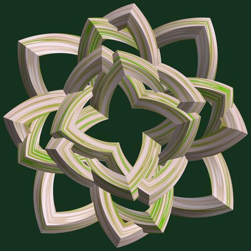Keywords: mathematica 3d cg parametricplot3d texture torus code program algorithm プログラム コード アルゴリズム 輪環 りんかん ドーナツ どーなつ 五芒星 ごぼうせい geometric sculpture geometricsculpture shape geometry sculpture mapping テクスチャ マッピング 模様 もよう abstract 抽象 ちゅうしょう アブストラクト design pattern デザイン パターン graphic グラフィック グラフィクス structure 意匠 構造 symmetry 対称性 たいしょうせい シンメトリー 対称 たいしょう tangle black background indoor a = 6; (* center hole size *) b = 5; (* penta-torus *) c = 1.8; (* distance from the center of rotation *) d = 4; (* number of torus *) h = 2; (* height of a torus *) SetOptions[ParametricPlot3D, PlotRange -> Full, Mesh -> None, Boxed -> False, Axes -> False, PlotPoints -> 400, ImageSize -> 3000, Background -> RGBColor[{20, 50, 30}/255], PlotStyle -> Directive[Specularity[White, 70], Texture[Import["D:/tmp/862.jpg"]]], TextureCoordinateFunction -> ({#4 + #5, #5 / Pi} &), Lighting -> "Neutral"]; f[v_] := TriangleWave[{-1, 1}, v/(2 Pi)]; g[v_] := TriangleWave[{-1, 1}, v/(2 Pi) + 1/4]; x = (a - g[t] - f[b s]) Cos[s] + c; y = (a - g[t] - f[b s]) Sin[s] + c; z = (a - f[t] - h f[b s]); rm = Table[{x, y, z}.RotationMatrix[2 i Pi/d, {0, 0, 1}], {i, d}]; ParametricPlot3D[rm, {t, 0, 2 Pi}, {s, 0, Pi}] (*--- The Texture *) a = 6; (* center hole size *) b = 5; (* penta-torus *) c = 1.8; (* distance from the center of rotation *) d = 4; (* number of torus *) h = 2; (* height of a torus *) SetOptions[ParametricPlot3D, PlotRange -> Full, Mesh -> None, Boxed -> False, Axes -> False, PlotPoints -> 400, ImageSize -> 3000, Background -> RGBColor[{20, 50, 30}/255], PlotStyle -> Directive[Specularity[White, 70], Texture[Import["D:/tmp/862.jpg"]]], TextureCoordinateFunction -> ({#4 + #5, #5 / Pi} &), Lighting -> "Neutral"]; f[v_] := TriangleWave[{-1, 1}, v/(2 Pi)]; g[v_] := TriangleWave[{-1, 1}, v/(2 Pi) + 1/4]; x = (a - g[t] - f[b s]) Cos[s] + c; y = (a - g[t] - f[b s]) Sin[s] + c; z = (a - f[t] - h f[b s]); rm = Table[{x, y, z}.RotationMatrix[2 i Pi/d, {0, 0, 1}], {i, d}]; ParametricPlot3D[rm, {t, 0, 2 Pi}, {s, 0, Pi}] (*--- The Texture *)