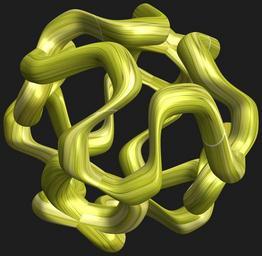 Keywords: mathematica 3d cg parametricplot3d texture torus 輪環 りんかん ドーナツ どーなつ 四芒星 しぼうせい 四光星 しこうせい 四稜星 しりょうせい code program algorithm コード プログラム アルゴリズム bamboo 竹 たけ タケ geometric sculpture geometricsculpture shape geometry sculpture mapping テクスチャ マッピング 模様 もよう abstract 抽象 ちゅうしょう アブストラクト design pattern デザイン パターン graphic グラフィック グラフィクス structure 意匠 構造 symmetry 対称性 たいしょうせい シンメトリー 対称 たいしょう algorithm コード black background indoor tangle a = 6; (* center hole size of a torus *) b = 4; (* tetra-torus *) c = -11; (* distance from the center of rotation *) d = 4; (* number of torus *) h = 2; (* height of a torus *) SetOptions[ParametricPlot3D, PlotRange -> Full, Mesh -> None, Boxed -> False, Axes -> False, PlotPoints -> 400, ImageSize -> 3000, Background -> RGBColor[{30, 30, 30}/255], PlotStyle -> Directive[Specularity[White, 50], Texture[Import["D:/tmp/71.jpg"]]], TextureCoordinateFunction -> ({#4 + #5, #5/Pi} &), Lighting -> "Neutral"]; f[v_] := Sin[2 Sin[Sin[Sin[v]]]]; x = (a - Cos[t] - f[b s]) Cos[s + Pi/(2 b)]; y = (a - Cos[t] - f[b s]) Sin[s + Pi/(2 b)]; z = (a - Sin[t] - h f[b s]) + c; rm = Table[{x, y, z}.RotationMatrix[2 i Pi/d, {1, 0, 0}], {i, d}]; ParametricPlot3D[rm, {t, 0, 2 Pi}, {s, 0, 2 Pi}] (*--- The Texture *) a = 6; (* center hole size of a torus *) b = 4; (* tetra-torus *) c = -11; (* distance from the center of rotation *) d = 4; (* number of torus *) h = 2; (* height of a torus *) SetOptions[ParametricPlot3D, PlotRange -> Full, Mesh -> None, Boxed -> False, Axes -> False, PlotPoints -> 400, ImageSize -> 3000, Background -> RGBColor[{30, 30, 30}/255], PlotStyle -> Directive[Specularity[White, 50], Texture[Import["D:/tmp/71.jpg"]]], TextureCoordinateFunction -> ({#4 + #5, #5/Pi} &), Lighting -> "Neutral"]; f[v_] := Sin[2 Sin[Sin[Sin[v]]]]; x = (a - Cos[t] - f[b s]) Cos[s + Pi/(2 b)]; y = (a - Cos[t] - f[b s]) Sin[s + Pi/(2 b)]; z = (a - Sin[t] - h f[b s]) + c; rm = Table[{x, y, z}.RotationMatrix[2 i Pi/d, {1, 0, 0}], {i, d}]; ParametricPlot3D[rm, {t, 0, 2 Pi}, {s, 0, 2 Pi}] (*--- The Texture *) |