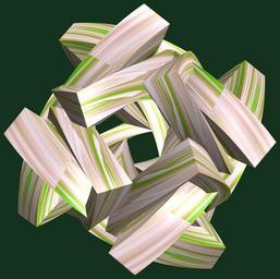 Keywords: mathematica 3d cg parametricplot3d texture torus code program algorithm tri-torus tritorus プログラム コード アルゴリズム 輪環 りんかん ドーナツ どーなつ 四芒星 しぼうせい geometric sculpture geometricsculpture shape geometry sculpture mapping テクスチャ マッピング 模様 もよう abstract 抽象 ちゅうしょう アブストラクト design pattern デザイン パターン graphic グラフィック グラフィクス structure 意匠 構造 symmetry 対称性 たいしょうせい シンメトリー 対称 たいしょう black background pastel photo border a = 4; (* center hole size *) b = 4; (* tetra-torus *) c = 4; (* distance from the center of rotation *) d = 4; (* number of torus *) h = 2; (* height of a torus *) SetOptions[ParametricPlot3D, PlotRange -> Full, Mesh -> None, Boxed -> False, Axes -> False, PlotPoints -> 400, ImageSize -> 3000, Background -> RGBColor[{20, 50, 30}/255], PlotStyle -> Directive[Specularity[White, 70], Texture[Import["D:/tmp/862.jpg"]]], TextureCoordinateFunction -> ({#4 + #5, #5 / Pi} &), Lighting -> "Neutral"]; f[v_] := TriangleWave[{-1, 1}, v/(2 Pi)]; g[v_] := TriangleWave[{-1, 1}, v/(2 Pi) + 1/4]; x = (a - g[t] - f[b s]) Cos[s] + c; y = (a - g[t] - f[b s]) Sin[s] + c; z = (a - f[t] - h f[b s]); rm = Table[{x, y, z}.RotationMatrix[2 i Pi/d, {1, 1, 1}], {i, d}]; ParametricPlot3D[rm, {t, 0, 2 Pi}, {s, 0, 2 Pi}] (*--- The Texture *) a = 4; (* center hole size *) b = 4; (* tetra-torus *) c = 4; (* distance from the center of rotation *) d = 4; (* number of torus *) h = 2; (* height of a torus *) SetOptions[ParametricPlot3D, PlotRange -> Full, Mesh -> None, Boxed -> False, Axes -> False, PlotPoints -> 400, ImageSize -> 3000, Background -> RGBColor[{20, 50, 30}/255], PlotStyle -> Directive[Specularity[White, 70], Texture[Import["D:/tmp/862.jpg"]]], TextureCoordinateFunction -> ({#4 + #5, #5 / Pi} &), Lighting -> "Neutral"]; f[v_] := TriangleWave[{-1, 1}, v/(2 Pi)]; g[v_] := TriangleWave[{-1, 1}, v/(2 Pi) + 1/4]; x = (a - g[t] - f[b s]) Cos[s] + c; y = (a - g[t] - f[b s]) Sin[s] + c; z = (a - f[t] - h f[b s]); rm = Table[{x, y, z}.RotationMatrix[2 i Pi/d, {1, 1, 1}], {i, d}]; ParametricPlot3D[rm, {t, 0, 2 Pi}, {s, 0, 2 Pi}] (*--- The Texture *) |
