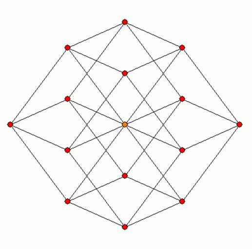 Keywords: 4-cube column graph.png 4-hypercube tesseract graph This hypercube graph is an orthogonal projection This oriented projection shows columns of vertices positioned a vertex-edge-vertex distance from one vertex on the left to one vertex on the right and edges attaching adjacent columns of vertices The number of vertices in each column represents rows in Pascal's triangle being 1 4 6 4 1 in the case of a 4-cube tesseract Note Starting with the tesseract the orthogonal projection shows vertices overlapping Here one orange vertex in the center is actually two in the same direction The counts of vertices at each 2d location are represented by colors red orange yellow green etc en wikipedia Sreejithk2000 CommonsHelper 2007-12-15 Tomruen wikipedia en 4-cube column graph svg Tomruen original upload log page en wikipedia 4-cube_column_graph gif 2007-12-15 01 24 Tomruen 422×418× 4294 bytes <nowiki>3-hypercube cube graph </nowiki> Original upload log wikitable - - 2010-05-28 19 04 19 422 × 418 4294 bytes File Upload Bot Magnus Manske <nowiki> en wikipedia subst CURRENTYEAR subst CURRENTMONTHNAME subst CURRENTDAY en 4- graph This hypercube graph is an en orthogonal projection</nowiki> Rhombic dodecahedral tesseract shadow; 15 vertices |