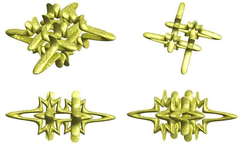 Keywords: mathematica 3d cg parametricplot3d texture torus 輪環 りんかん ドーナツ どーなつ 八芒星 はちぼうせい program プログラム code コード algorithm コード アルゴリズム geometric sculpture geometricsculpture shape geometry sculpture mapping テクスチャ マッピング 模様 もよう design pattern デザイン パターン graphic グラフィック グラフィクス structure 意匠 構造 symmetry 対称性 たいしょうせい シンメトリー 対称 たいしょう algorithm white background monochrome plant foliage tree organic pattern a = 4; (* center hole size of a torus *) b = 8; (* octa-torus *) c = 3; (* distance from the center of rotation *) d = 4; (* number of torus *) SetOptions[ParametricPlot3D, PlotRange -> Full, Mesh -> None, Boxed -> False, Axes -> None, PlotPoints -> 400, ImageSize -> 1000, PlotStyle -> Directive[Specularity[White, 30], Texture[Import["D:/tmp/71.jpg"]]], TextureCoordinateFunction -> ({#4, #5 b Pi} &), Lighting -> "Neutral"]; g[v_] := Sum[Cos[(2 k - 1) v]/(2 k - 1), {k, 4}]; x = (a - Cos[t] - Sin[b s]) g[s + Pi/(2 b)] + c; y = Sin[t] + c; z = (a - Cos[t] - Sin[b s]) Sin[s + Pi/(2 b)] + c; rot = Table[{x, y, z}.RotationMatrix[2 i Pi/d, {0, 0, 1}], {i, d}]; ParametricPlot3D[rot, {t, 0, 2 Pi}, {s, 0, 2 Pi}] (*--- The Texture The g[] is a 4-partial sum of the Fourier series for Square wave. g[]は矩形波のフーリエ展開の最初の4項 *) a = 4; (* center hole size of a torus *) b = 8; (* octa-torus *) c = 3; (* distance from the center of rotation *) d = 4; (* number of torus *) SetOptions[ParametricPlot3D, PlotRange -> Full, Mesh -> None, Boxed -> False, Axes -> None, PlotPoints -> 400, ImageSize -> 1000, PlotStyle -> Directive[Specularity[White, 30], Texture[Import["D:/tmp/71.jpg"]]], TextureCoordinateFunction -> ({#4, #5 b Pi} &), Lighting -> "Neutral"]; g[v_] := Sum[Cos[(2 k - 1) v]/(2 k - 1), {k, 4}]; x = (a - Cos[t] - Sin[b s]) g[s + Pi/(2 b)] + c; y = Sin[t] + c; z = (a - Cos[t] - Sin[b s]) Sin[s + Pi/(2 b)] + c; rot = Table[{x, y, z}.RotationMatrix[2 i Pi/d, {0, 0, 1}], {i, d}]; ParametricPlot3D[rot, {t, 0, 2 Pi}, {s, 0, 2 Pi}] (*--- The Texture The g[] is a 4-partial sum of the Fourier series for Square wave. g[]は矩形波のフーリエ展開の最初の4項 *) |