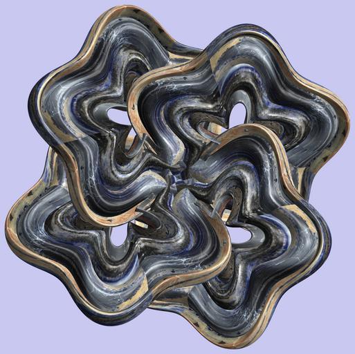 | Keywords: mathematica 3d cg parametricplot3d texture torus code program algorithm プログラム コード アルゴリズム 輪環 りんかん ドーナツ どーなつ トーラス とーらす mapping テクスチャ マッピング 模様 もよう abstract 抽象 ちゅうしょう アブストラクト design pattern デザイン パターン graphic グラフィック グラフィクス structure 意匠 構造 symmetry 対称性 たいしょうせい シンメトリー 対称 たいしょう drawing door architecture indoor ancient white background painting surreal tangle a = 5; (* center hole size of a torus *) b1 = 5;(* the number of angles *) b2 = 4;(* the number of waves *) c = 4; (* distance from the center of rotation *) d = 4; (* the number of tori *) h1 = 3; (* width of a torus *) h2 = 1; (* width of a torus *) SetOptions[ParametricPlot3D, PlotRange -> Full, Mesh -> None, Boxed -> False, Axes -> None, PlotPoints -> 500, ImageSize -> 3000, Background -> RGBColor[{200, 200, 240}/255], PlotStyle -> Directive[Specularity[White, 70], Texture[Import["D:/tmp/94.jpg"]]], TextureCoordinateFunction -> ({#4, #5 Pi} &), Lighting -> "Neutral"]; f[v_] := Sin[2 Sin[Sin[Sin[v]]]]; x = (a - h1 Cos[t] + h2 f[b1 s]) Cos[s] + c; y = (a - h1 Cos[t] + h2 f[b1 s]) Sin[s] + c; z = f[b2 t]; rm = Table[{x, y, z}.RotationMatrix[2 i Pi/d, {0, 1, 2}], {i, d}]; ParametricPlot3D[rm, {t, 0, 2 Pi}, {s, 0, 2 Pi}] (*--- The Texture *) a = 5; (* center hole size of a torus *) b1 = 5;(* the number of angles *) b2 = 4;(* the number of waves *) c = 4; (* distance from the center of rotation *) d = 4; (* the number of tori *) h1 = 3; (* width of a torus *) h2 = 1; (* width of a torus *) SetOptions[ParametricPlot3D, PlotRange -> Full, Mesh -> None, Boxed -> False, Axes -> None, PlotPoints -> 500, ImageSize -> 3000, Background -> RGBColor[{200, 200, 240}/255], PlotStyle -> Directive[Specularity[White, 70], Texture[Import["D:/tmp/94.jpg"]]], TextureCoordinateFunction -> ({#4, #5 Pi} &), Lighting -> "Neutral"]; f[v_] := Sin[2 Sin[Sin[Sin[v]]]]; x = (a - h1 Cos[t] + h2 f[b1 s]) Cos[s] + c; y = (a - h1 Cos[t] + h2 f[b1 s]) Sin[s] + c; z = f[b2 t]; rm = Table[{x, y, z}.RotationMatrix[2 i Pi/d, {0, 1, 2}], {i, d}]; ParametricPlot3D[rm, {t, 0, 2 Pi}, {s, 0, 2 Pi}] (*--- The Texture *) |