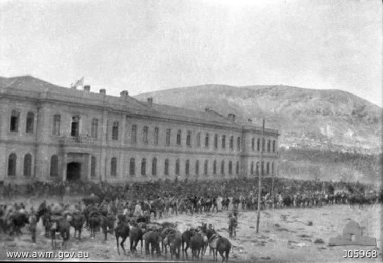 | Keywords: 4ALHinDamascus.jpg watermark AWM caption THE SCENE AT THE TURKISH HOSPITAL AT DAMASCUS IN 1918 SHORTLY AFTER THE ENTRY OF THE 4TH ALH REGIMENT THE PICTURE SHOWS THE AUSTRALIANS ROUNDING UP THE 10 000 PRISONERS CAPTURED HERE ONE OF THE FIGURES IN THE CENTRE IS COLONEL BOURCHIER J05968 Credit line DONATED BY MR J A HENDERSON circa October 1918 photographer not identified Copyright expired - public domain PD-AustraliaGov World War I forces of Australia in Egypt and Palestine World War I forces of the Ottoman Empire in Egypt and Palestine World War I military hospitals Prisoners of war from the Ottoman Empire in World War I World War I cavalry Black and white photographs Ottoman Hospitals Damascus |
