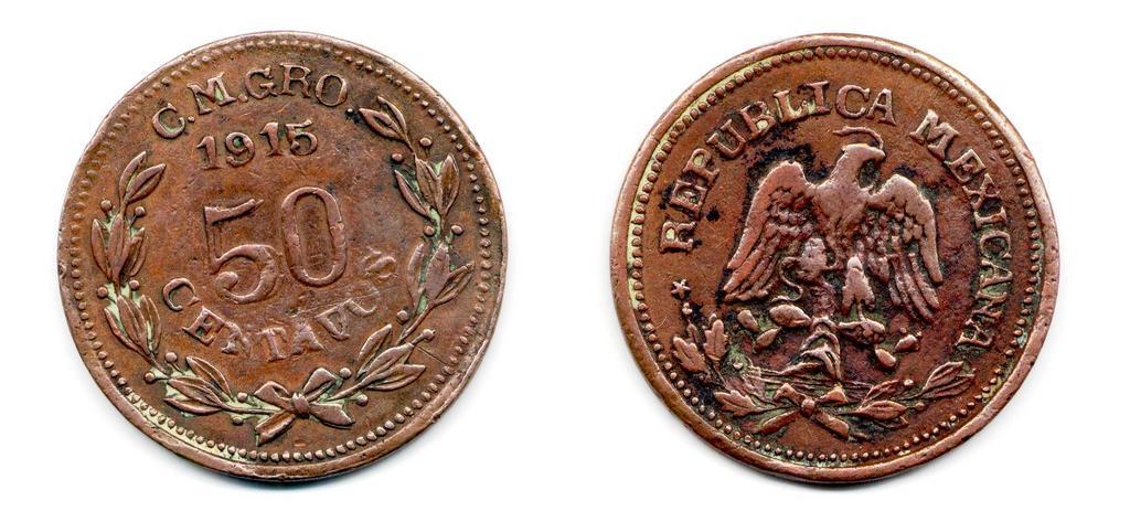 Keywords: 50 centavos de Campo Morado de 1915 (2)(cobre)(anverso y reverso).jpg es Moneda de cobre de 50 centavos acuñada en Campo Morado en 1915 2012-04-12 own Inri PD-Mexico cc-zero Uploaded with UploadWizard Coins of Mexico