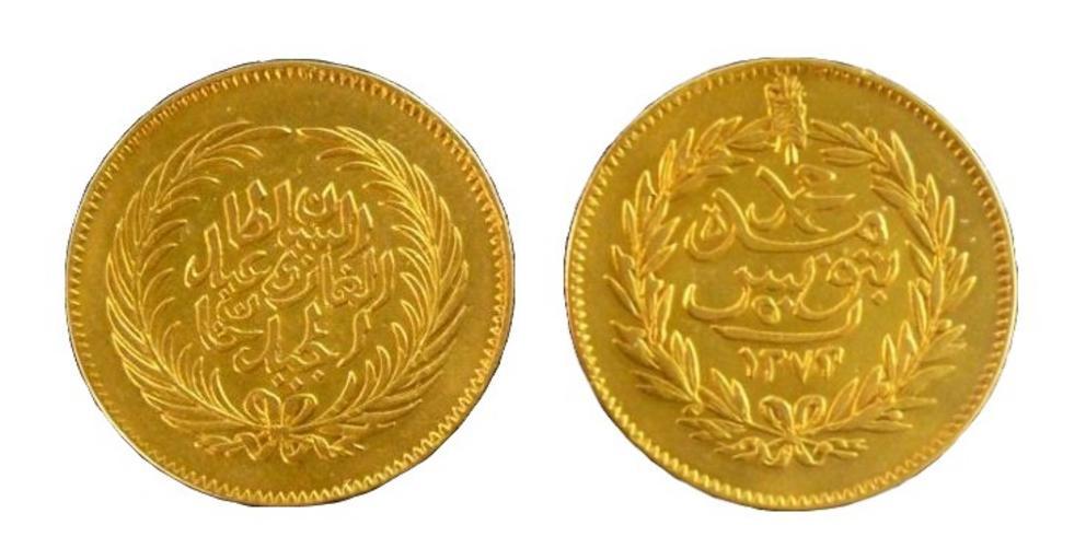 Keywords: 50 Tunisian Rial - 1272 AH.jpg en 50 Tunisian Rial coin gold 9 60 g 26 5 mm struck in Tunis in 1272 AH during the reign of Muhammad II Bey own DrFO Jr Tn 2010 Tunisian rial coins