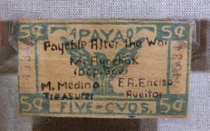Keywords: 5 centavo emergency circulating note, Apayo, Philippines, during the Japanese occupation - Spurlock Museum, UIUC - DSC06073.jpg en Exhibit in the Spurlock Museum University of Illinois at Urbana-Champaign - Urbana-Champaign Illinois USA This work is old enough so that it is in the public domain 2015-06-14 16 40 58 own Daderot other versions cc-zero Banknotes in the Spurlock Museum Japanese government-issued pesos in the Philippines |