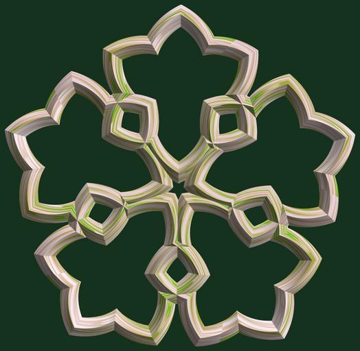 Keywords: mathematica 3d cg parametricplot3d texture torus code program algorithm プログラム コード アルゴリズム 輪環 りんかん ドーナツ どーなつ 六芒星 ろくぼうせい geometric sculpture geometricsculpture shape geometry sculpture mapping テクスチャ マッピング 模様 もよう abstract 抽象 ちゅうしょう アブストラクト design pattern デザイン パターン graphic グラフィック グラフィクス structure 意匠 構造 symmetry 対称性 たいしょうせい シンメトリー 対称 たいしょう indoor tangle black background a = 6; (* center hole size *) b = 6; (* hexa-torus *) c = 6; (* distance from the center of rotation *) d = 5; (* number of torus *) h = 0; (* height of a torus *) SetOptions[ParametricPlot3D, PlotRange -> Full, Mesh -> None, Boxed -> False, Axes -> False, PlotPoints -> 400, ImageSize -> 3000, Background -> RGBColor[{20, 50, 30}/255], PlotStyle -> Directive[Specularity[White, 40], Texture[Import["D:/tmp/862.jpg"]]], TextureCoordinateFunction -> ({#4 + #5, #5 / Pi} &), Lighting -> "Neutral"]; f[v_] := TriangleWave[{-1, 1}, v/(2 Pi)]; g[v_] := TriangleWave[{-1, 1}, v/(2 Pi) + 1/4]; x = (a - g[t] - f[b s]) Cos[s] + c; y = (a - g[t] - f[b s]) Sin[s] + c; z = (a - f[t] - h f[b s]); rm = Table[{x, y, z}.RotationMatrix[2 i Pi/d, {0, 0, 1}], {i, d}]; ParametricPlot3D[rm, {t, 0, 2 Pi}, {s, 0, Pi}] (*--- The Texture *) a = 6; (* center hole size *) b = 6; (* hexa-torus *) c = 6; (* distance from the center of rotation *) d = 5; (* number of torus *) h = 0; (* height of a torus *) SetOptions[ParametricPlot3D, PlotRange -> Full, Mesh -> None, Boxed -> False, Axes -> False, PlotPoints -> 400, ImageSize -> 3000, Background -> RGBColor[{20, 50, 30}/255], PlotStyle -> Directive[Specularity[White, 40], Texture[Import["D:/tmp/862.jpg"]]], TextureCoordinateFunction -> ({#4 + #5, #5 / Pi} &), Lighting -> "Neutral"]; f[v_] := TriangleWave[{-1, 1}, v/(2 Pi)]; g[v_] := TriangleWave[{-1, 1}, v/(2 Pi) + 1/4]; x = (a - g[t] - f[b s]) Cos[s] + c; y = (a - g[t] - f[b s]) Sin[s] + c; z = (a - f[t] - h f[b s]); rm = Table[{x, y, z}.RotationMatrix[2 i Pi/d, {0, 0, 1}], {i, d}]; ParametricPlot3D[rm, {t, 0, 2 Pi}, {s, 0, Pi}] (*--- The Texture *) |